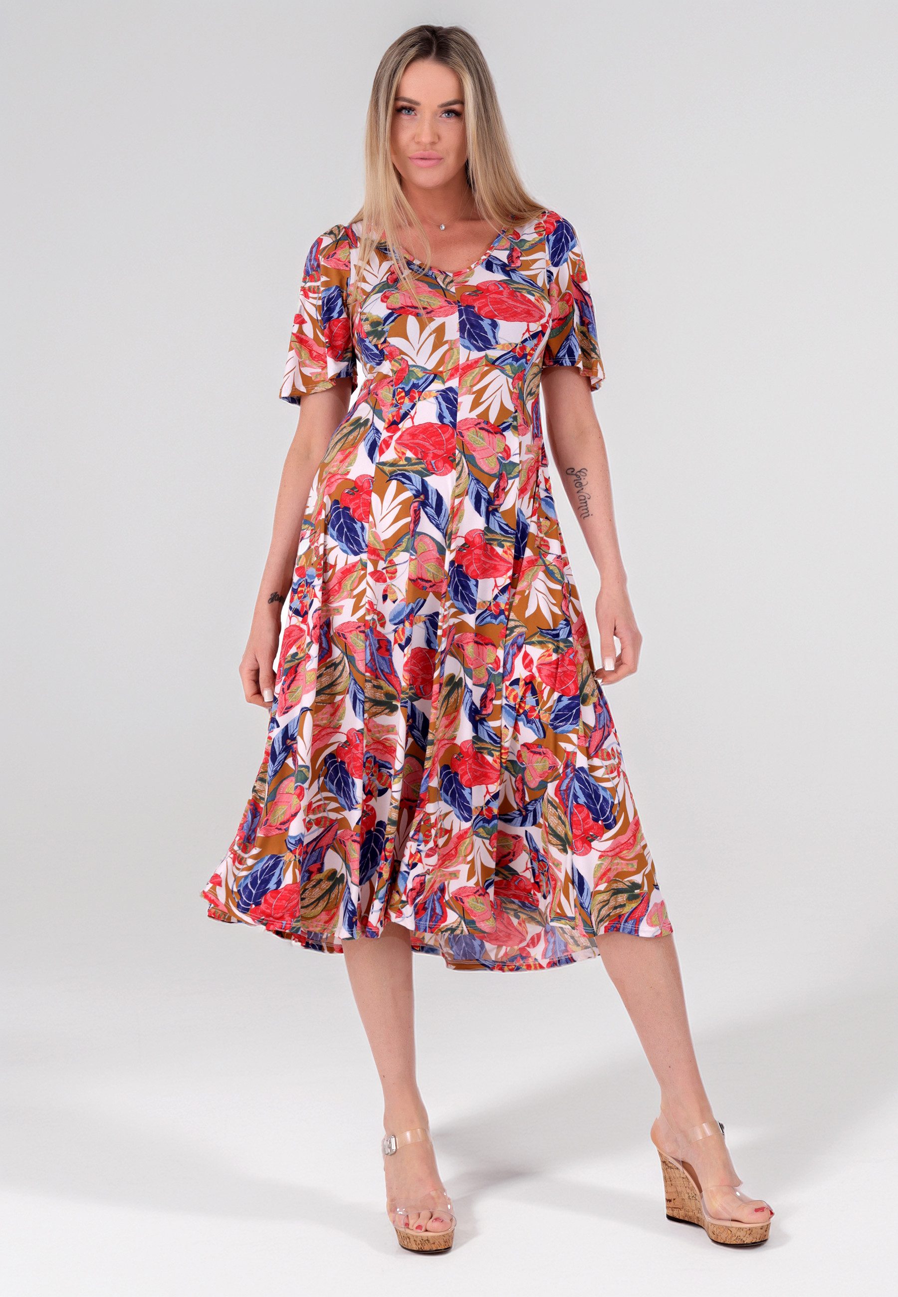 Ein Kleid, das Leichtigkeit und Eleganz perfekt vereint! Mit seinem farbenfrohen, kunstvollen Muster ist es ein echter Hingucker. Der sanfte V-Ausschnitt vorn unterstreicht die feminine Ausstrahlung, während der hochgeschlossene Rücken mit schlichter Raffinesse begeistert.