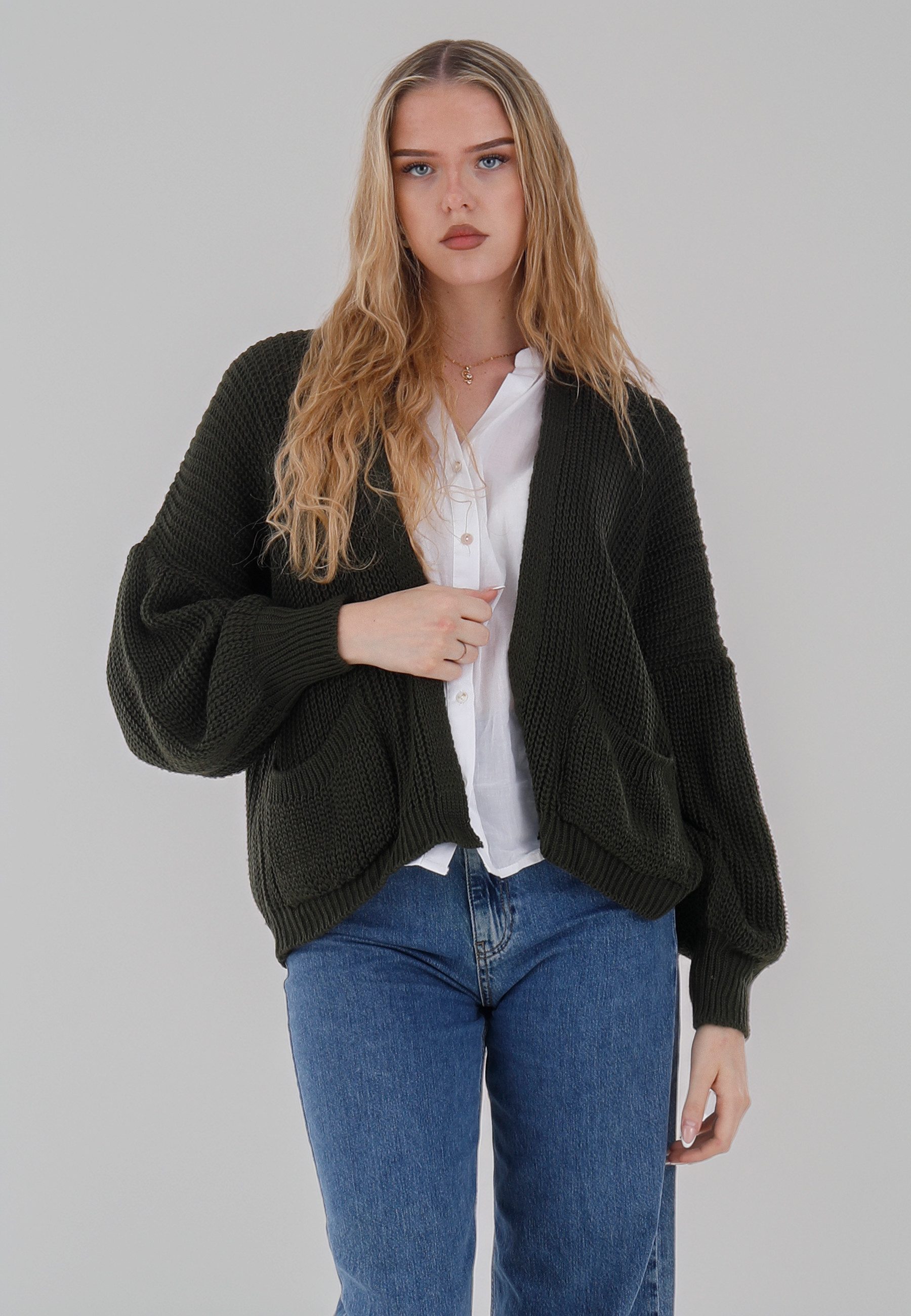 Zwei aufgesetzte Taschen an der Vorderseite verleihen dem Bolero nicht nur einen stylischen Akzent, sondern auch praktische Funktion. Ob über einem Kleid, einem Basic-Top oder einem klassischen Blusenshirt – dieser Cardigan lässt sich mühelos kombinieren und wertet selbst schlichte Outfits optisch auf.