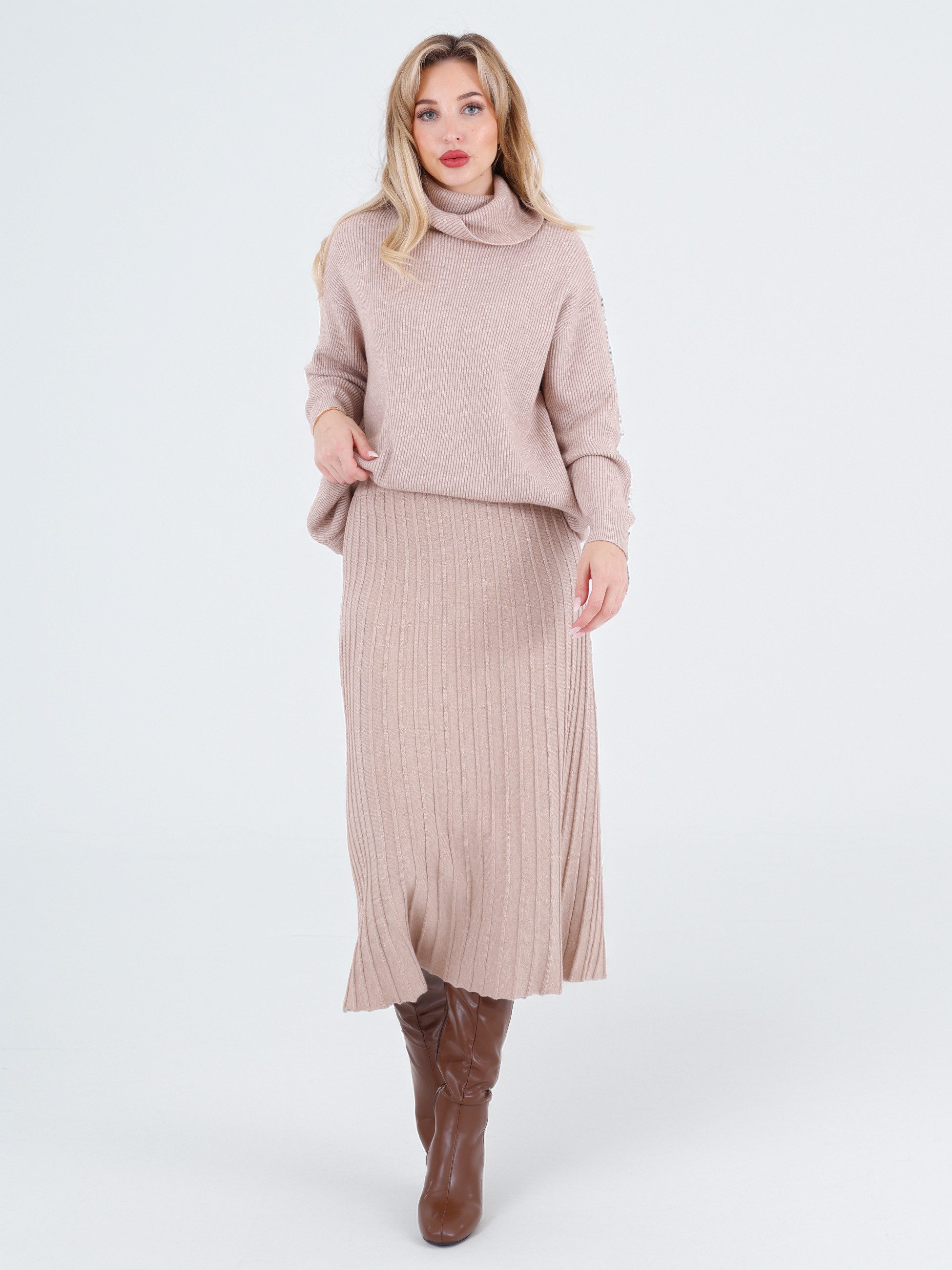 Dieser elegante Damen Strickrock überzeugt durch seine moderne Rippstruktur und den fließenden Fall. Der elastische Bund sorgt für eine bequeme Passform und bietet Bewegungsfreiheit im Alltag. Dank des zeitlosen Designs lässt sich der Rock vielseitig kombinieren – ob lässig oder elegant.