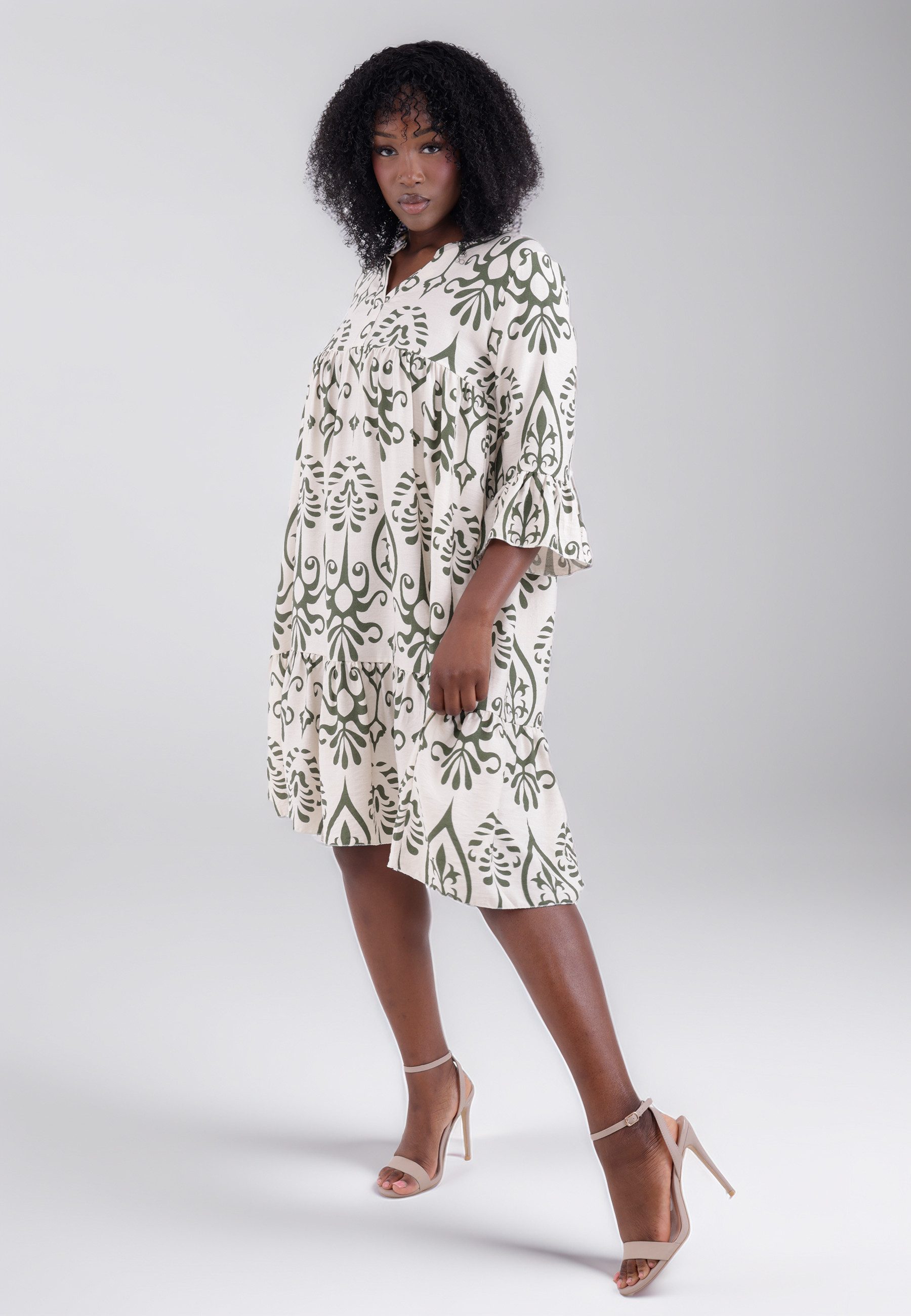 Der elegante Tunika-Ausschnitt und das dekorative Ethno-Muster in mehreren Farben, auf cremefarbenem Grund machen das Kleid zu einem echten Blickfang – ob für den Stadtbummel, ein Gartenfest oder einfach für den Alltag mit Stil.