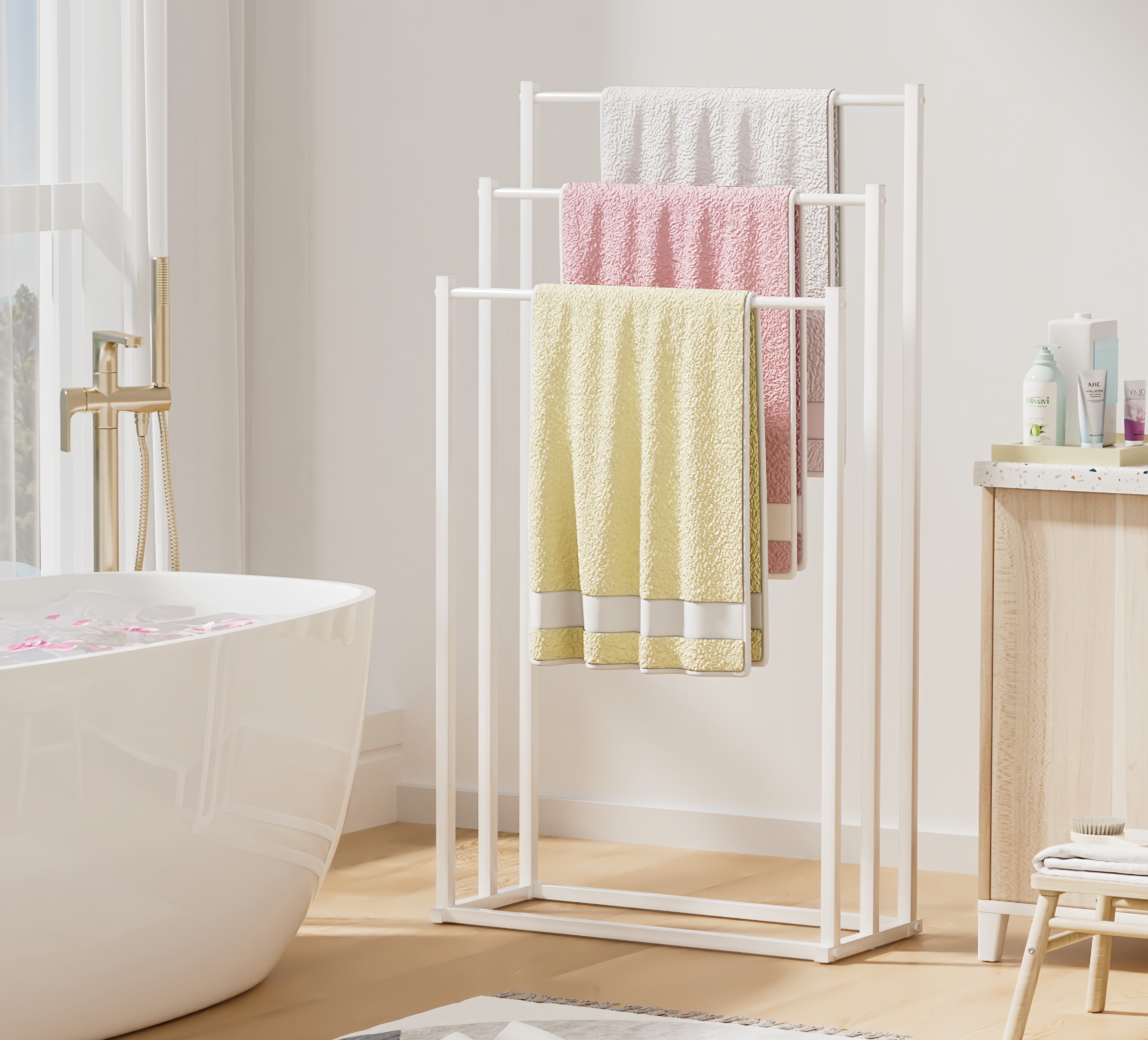 Badetücher Saunatücher oder Duschtücher können auf dem praktischen Stand Handtuchhalter zum Trocknen aufgehängt werden