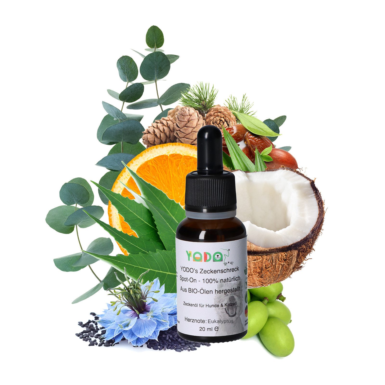 Wir lieben die Natur und unsere Tiere, deshalb verwenden wir nur die besten Zutaten. Einzelne Öle beeindrucken Parasiten wie Zecken, Flöhe und Mücken nicht, entscheidend ist das Zusammenspiel verschiedener Öle. YODO’S ZECKENSCHRECK enthält eine kraftvolle Kombination aus sieben BIO-Ölen und ätherischen BIO-Ölen, die gezielt Zecken und andere Parasiten fernhalten. Die sorgfältige Auswahl dieser hochwertigen natürlichen Inhaltsstoffe sorgt nicht nur für den bestmöglichen Schutz, sondern ist auch schonend für das Fell und die Haut Ihres Haustiers. Die Kombination aus sieben kraftvollen BIO-Ölen sorgt für eine natürliche Barriere gegen Zecken und andere Parasiten. Die enthaltenen Öle sind:
