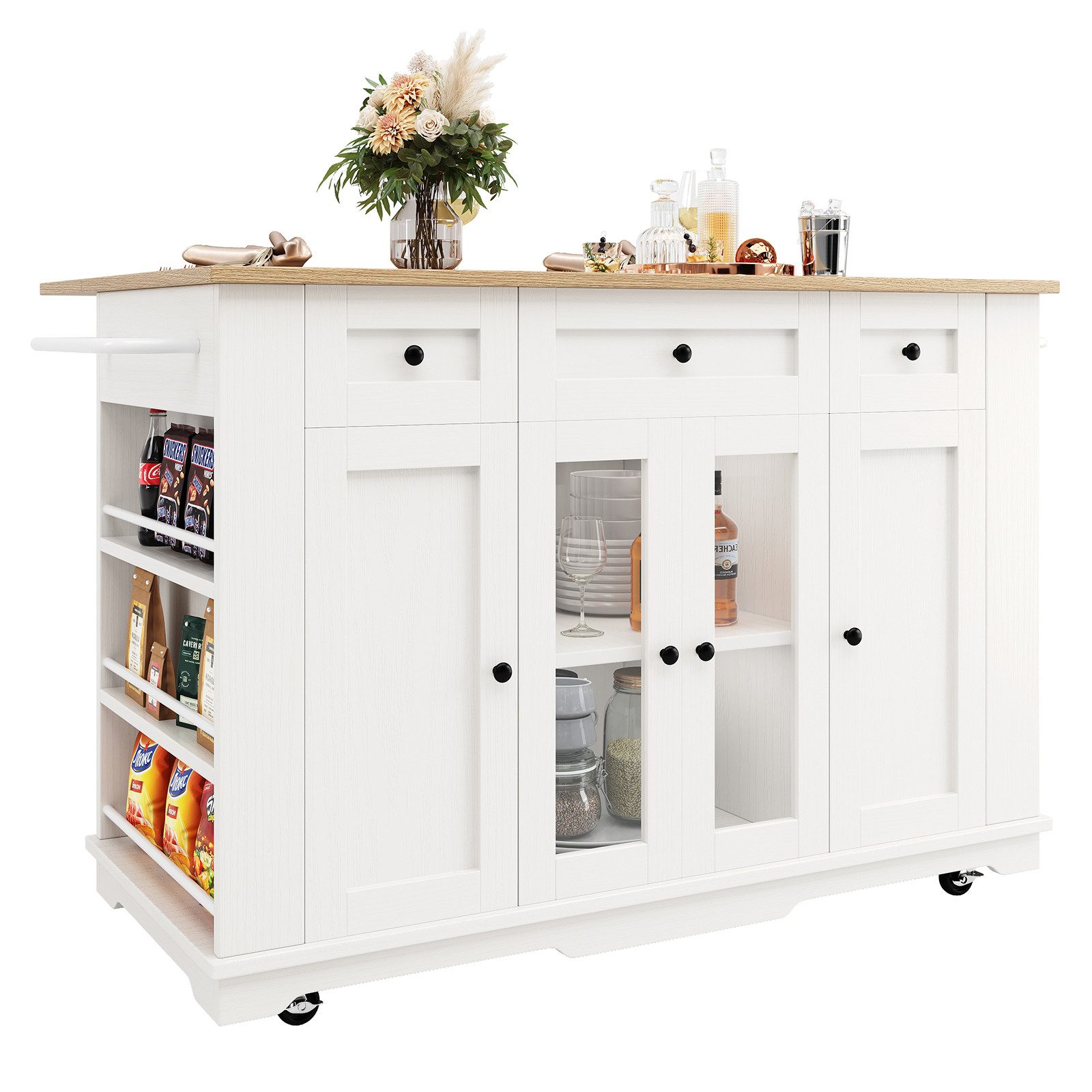 Mit vielseitigen und geräumigen Aufbewahrungsmöglichkeiten fasst die Kücheninsel viele Utensilien auf - von Kochgeschirr bis zu Snacks - und hält die Küche organisiert.