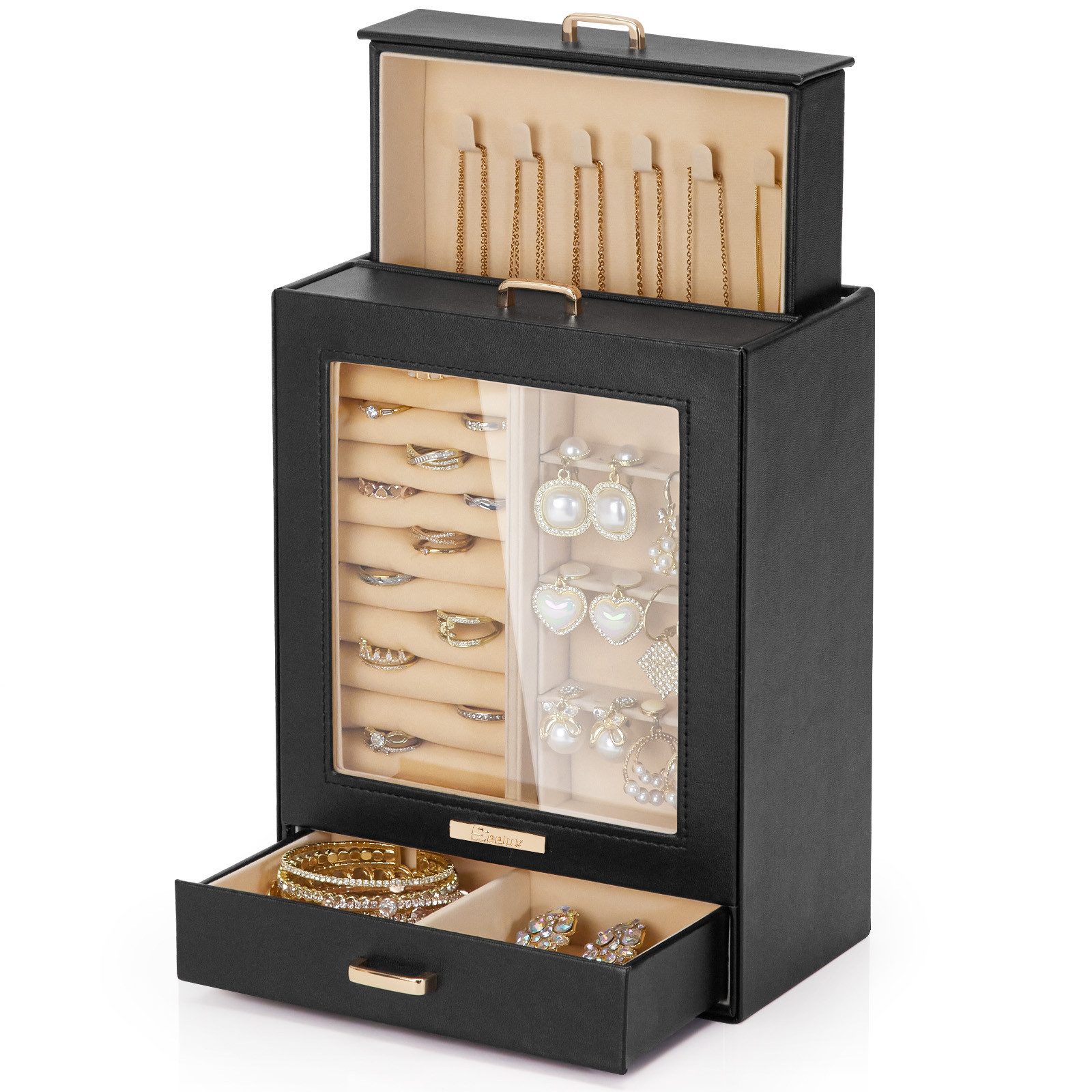 Elegantes Design: Stilvolles, minimalistisch gestaltetes Schmuckkästchen mit durchsichtigen Sichtfenstern für eine ansprechende Präsentation Ihrer Accessoires.