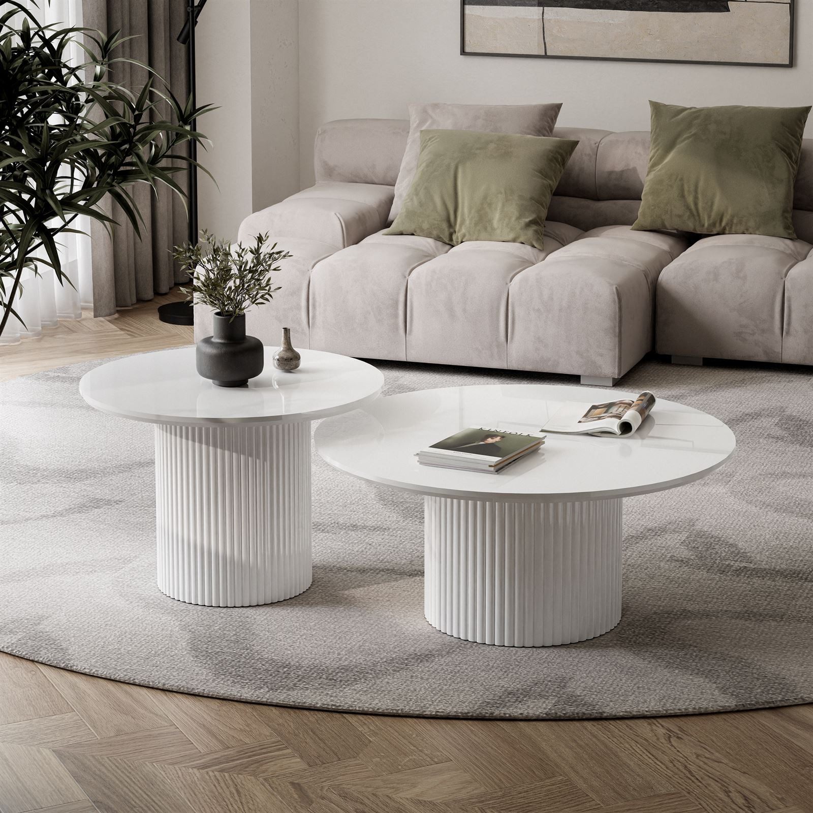 Zweiteiliges Couchtisch-Set OVI mit runder Form und markantem Lamellen-/Riffel-Detail am unteren Korpus. Zwei Größen lassen sich flexibel kombinieren und bieten Platz für Tassen, Teller oder eine Vase. Farbvarianten zur Auswahl.