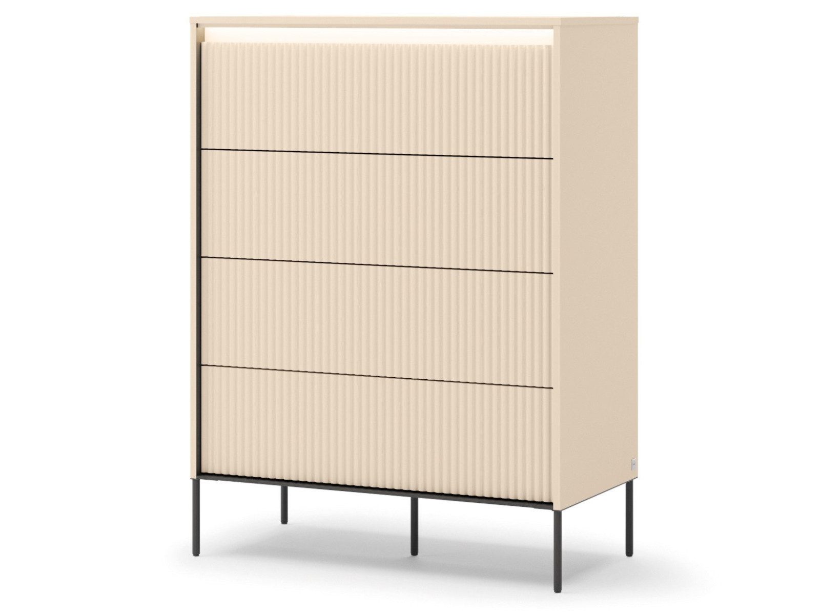 Die geriffelten Fronten sind ein Detail, das diese Kommode von anderen abhebt. Die subtilen Rillen verleihen dem Möbel einen modernen und zugleich eleganten Look. Sie ist die perfekte Art, den Stil Ihres Schlafzimmers zu betonen, egal ob es im skandinavischen, glamourösen oder klassischen Stil eingerichtet ist. Die Kommode mit geriffelten Fronten ist ein Blickfang und ein einzigartiges Dekorationselement.