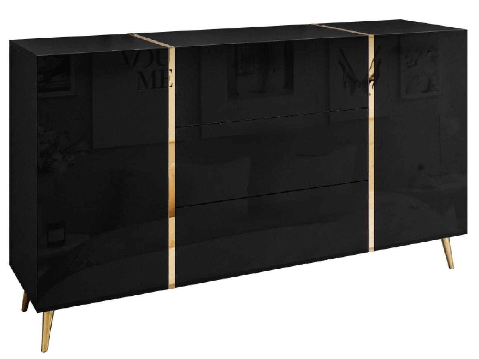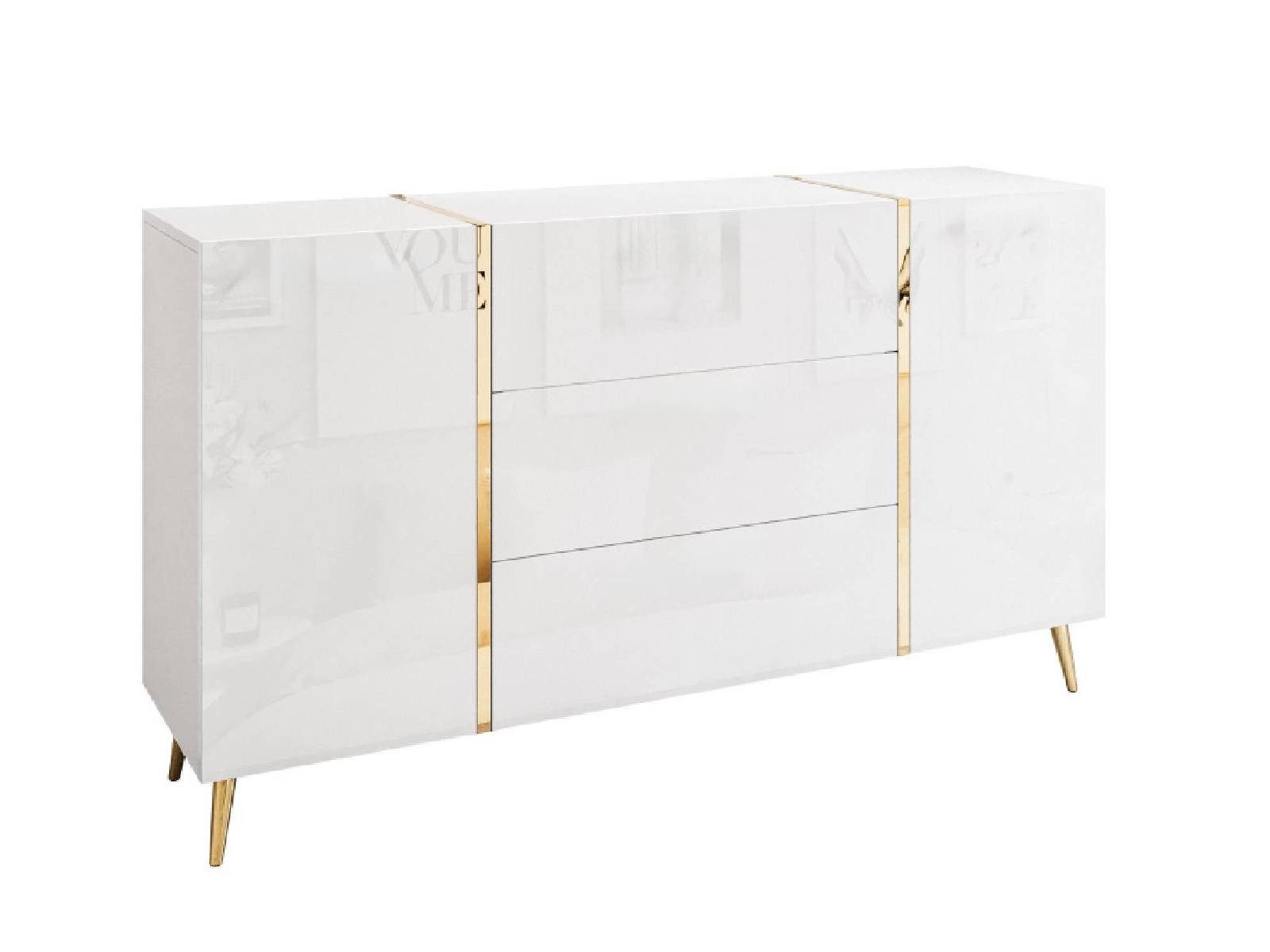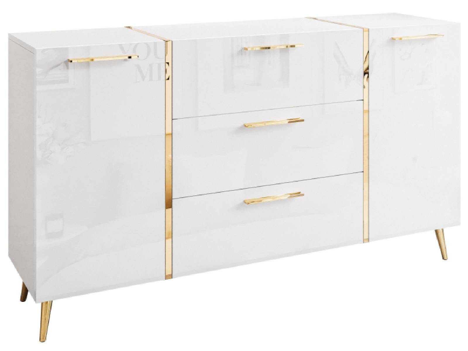 Die hochglänzenden Fronten in Kombination mit goldfarbenen Akzenten verleihen dem Möbelstück eine elegante Ausstrahlung und passen perfekt zu glamourösen, modern-klassischen oder New Yorker Interieurs. Die dekorativen, schlanken Metallbeine in Goldoptik sorgen für visuelle Leichtigkeit und setzen stilvolle Akzente.