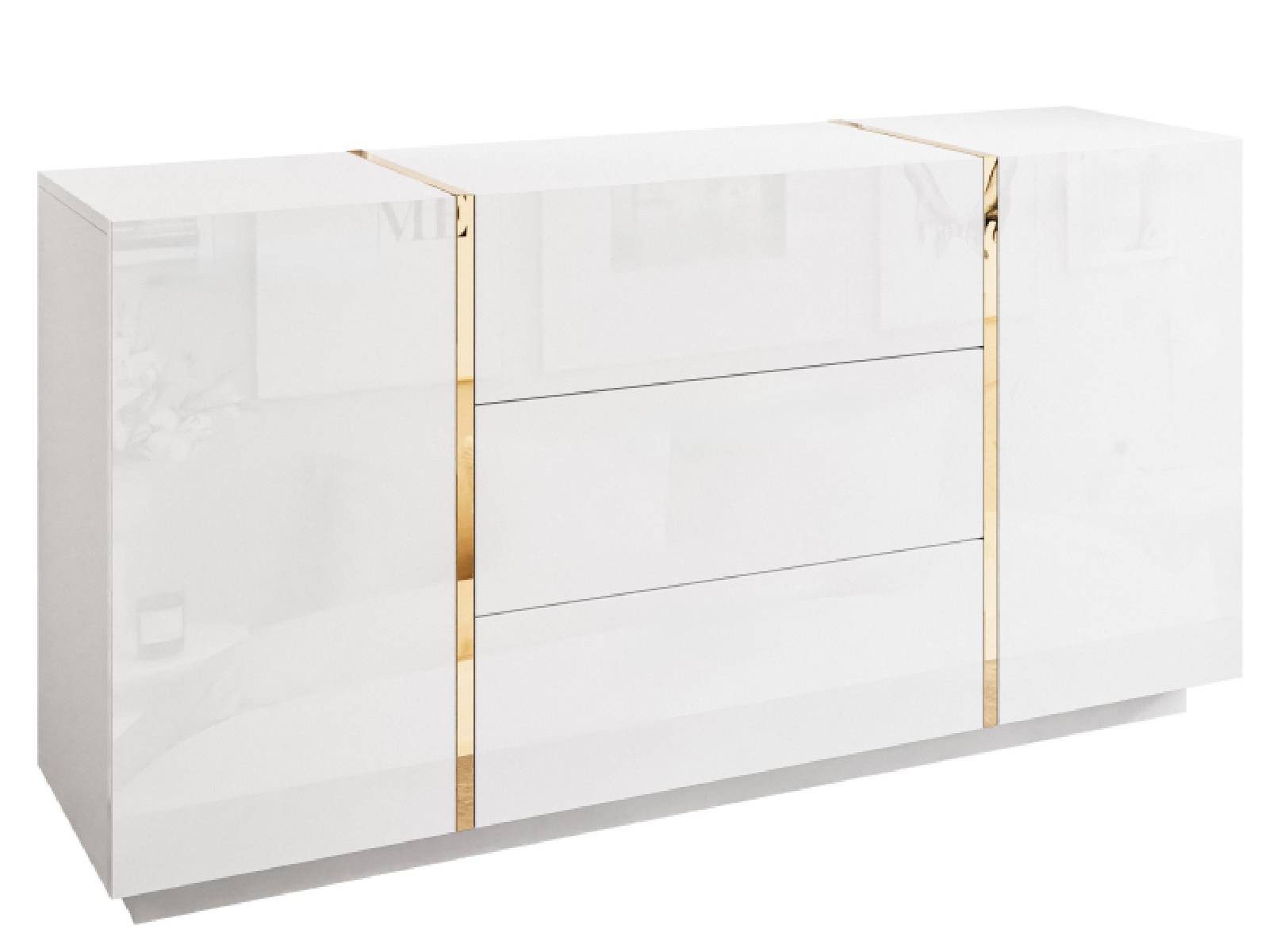 Der Korpus besteht aus robuster, matt laminierter Platte, ergänzt durch hochglänzende Fronten. Die goldfarbenen Details und der formschöne Sockel verleihen dem Möbel Leichtigkeit und unterstreichen sein zeitgemäßes Design.