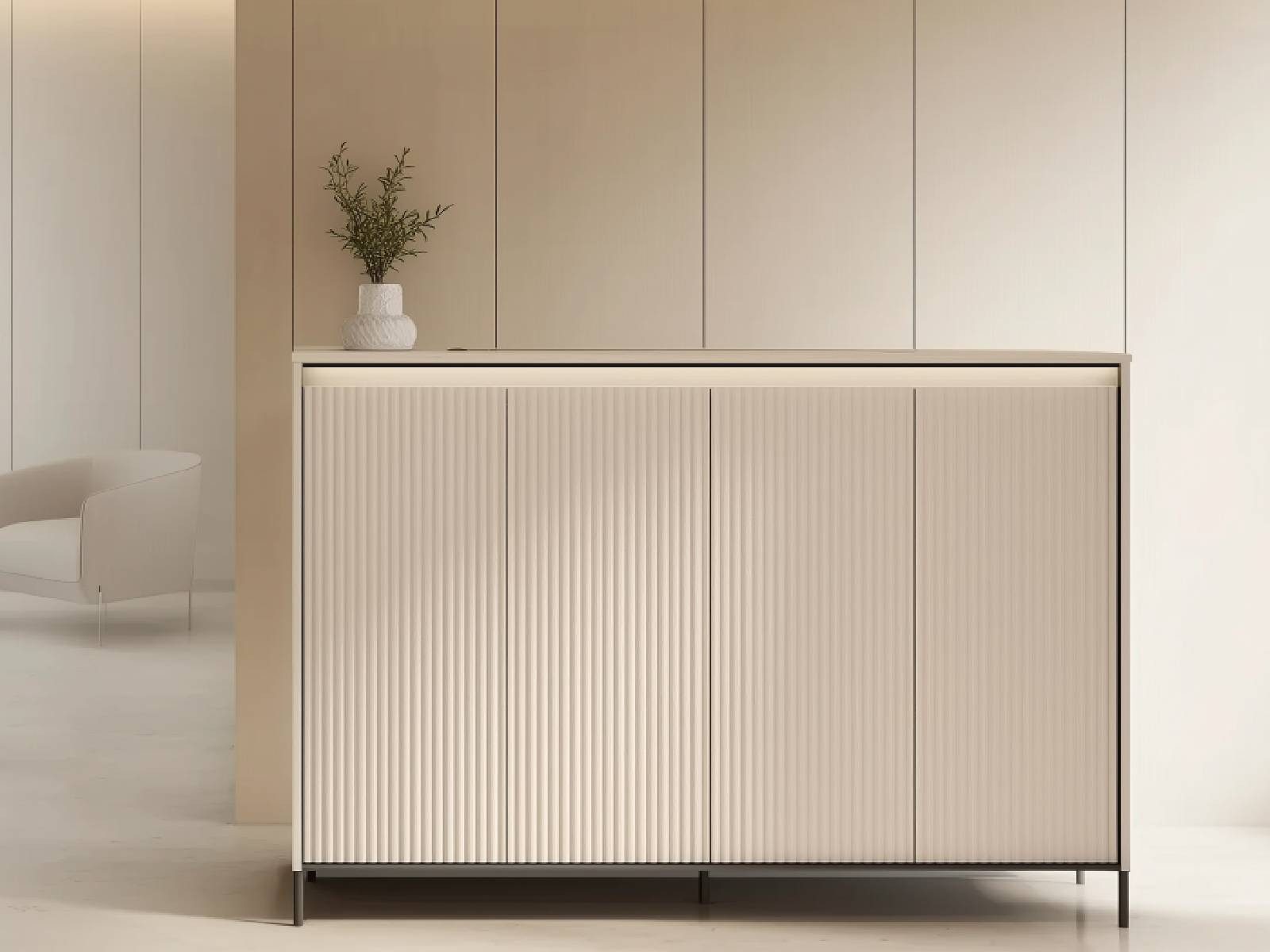 Großzügige Flur-/Garderobenkommode für Diele und Eingangsbereich. Die TG-04 bietet viel Stauraum auf schlanker Tiefe und hält den Eingangsbereich sichtbar aufgeräumt. Das zeitlose Farbduo Beige Sand/Schwarz passt zu Spiegel, Garderobenpaneel & Schuhbank. Inklusive LED-Beleuchtung für bessere Übersicht und stimmige Lichtatmosphäre.