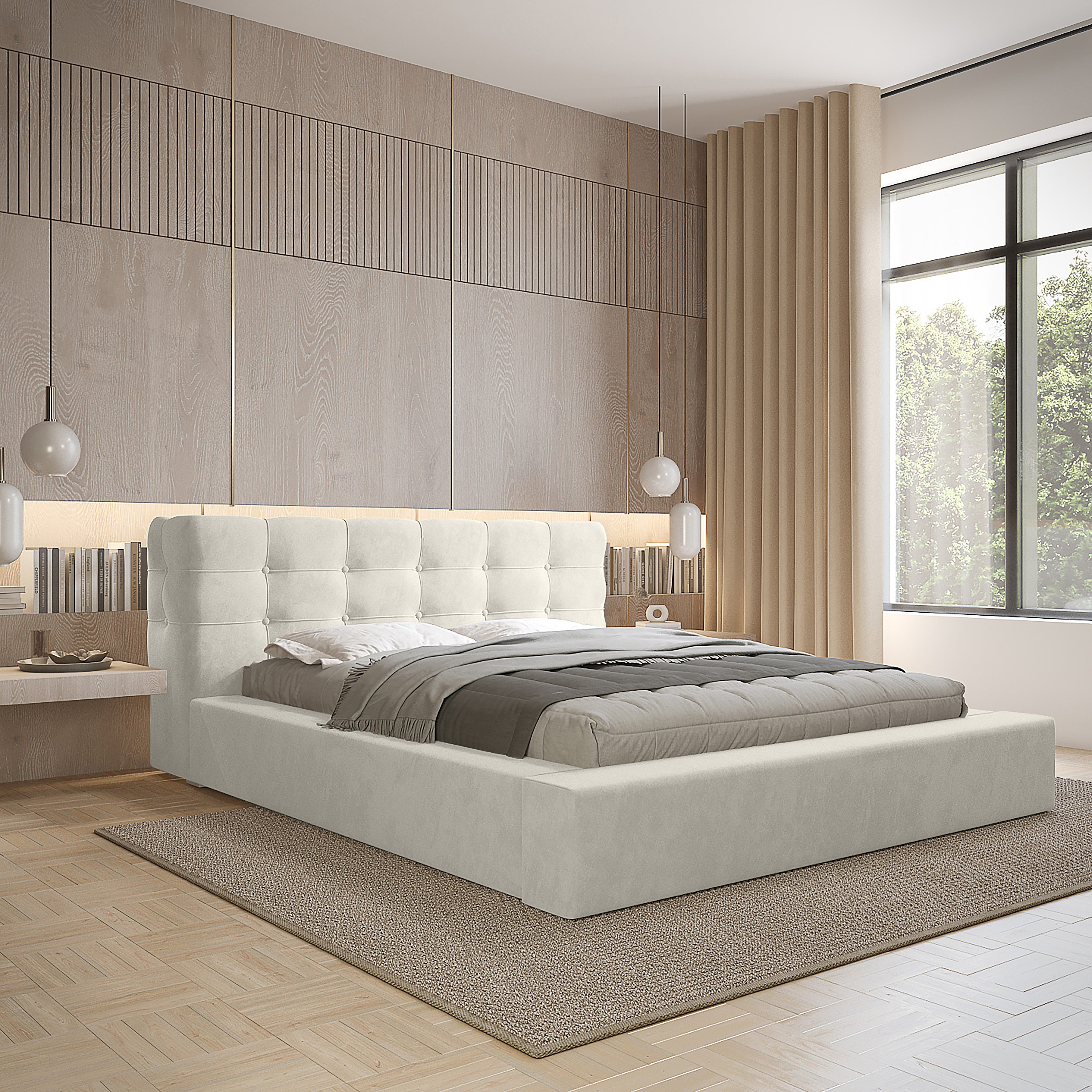 inkl. Bettkasten inkl. Holzlattenrost Widerstandsfähiger und angenehm zu berührender Stoff Kopfteil mit Steppung und gepolsterter Korpus ohne Matratze ohne Nachttisch