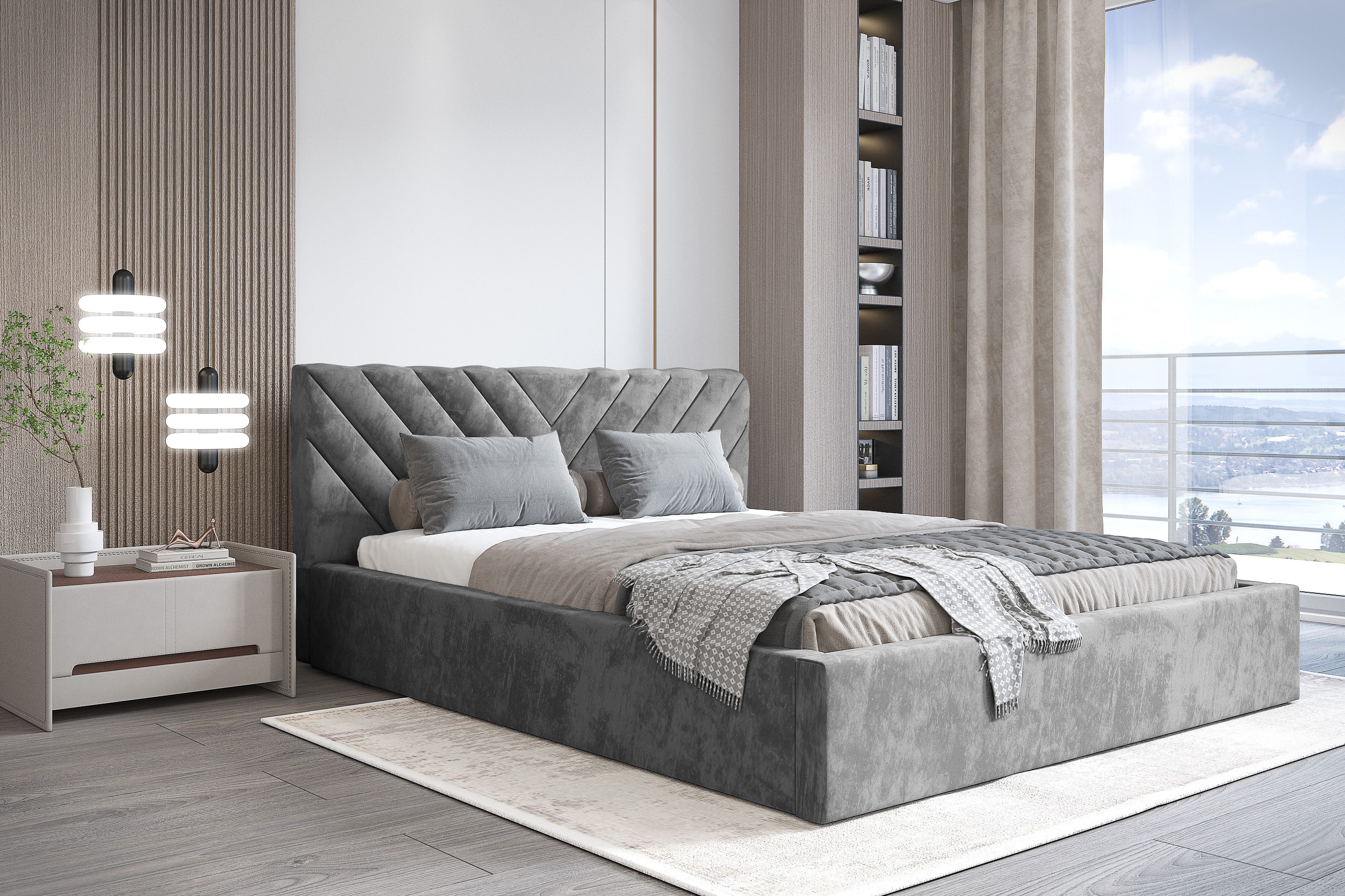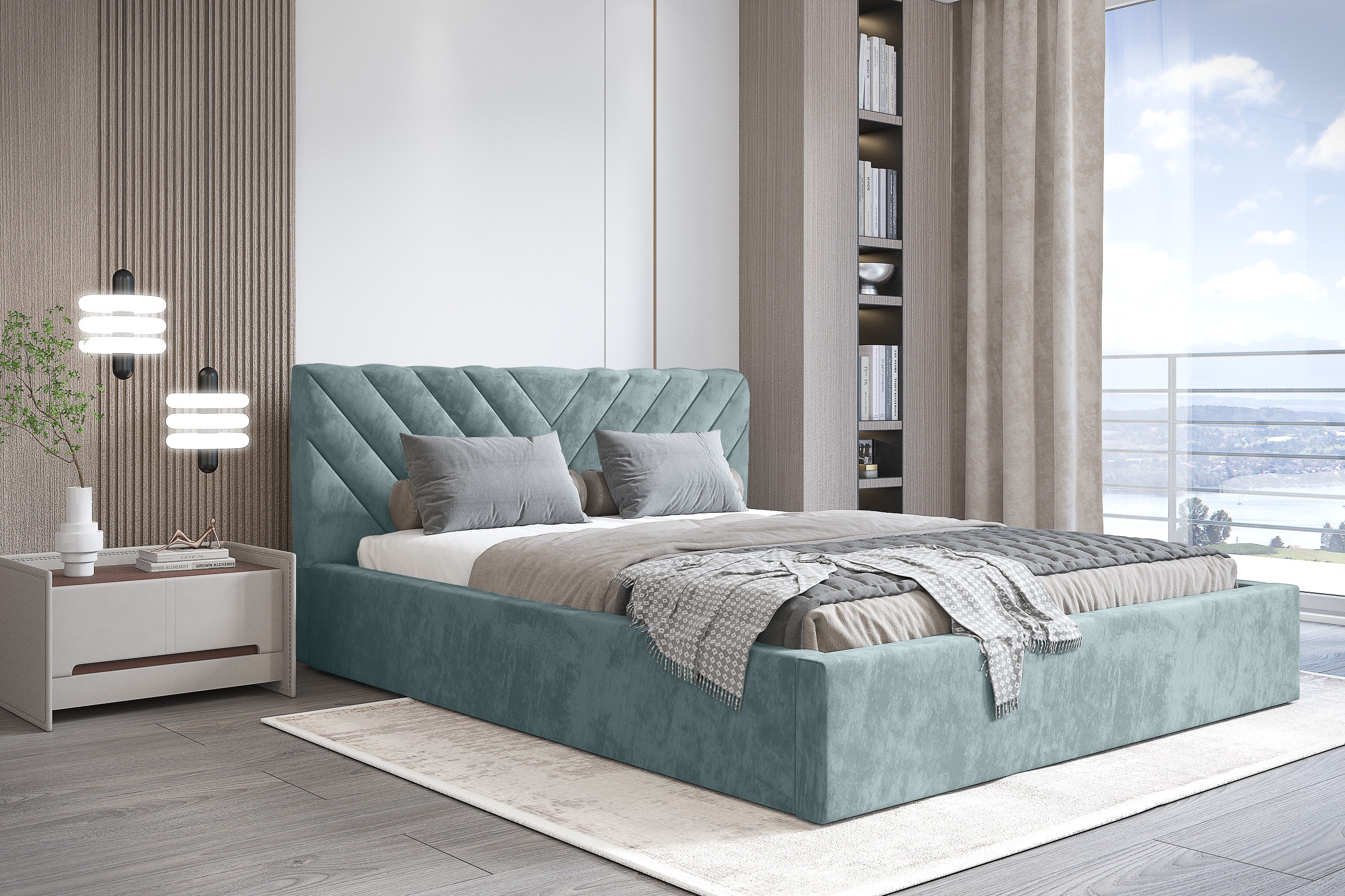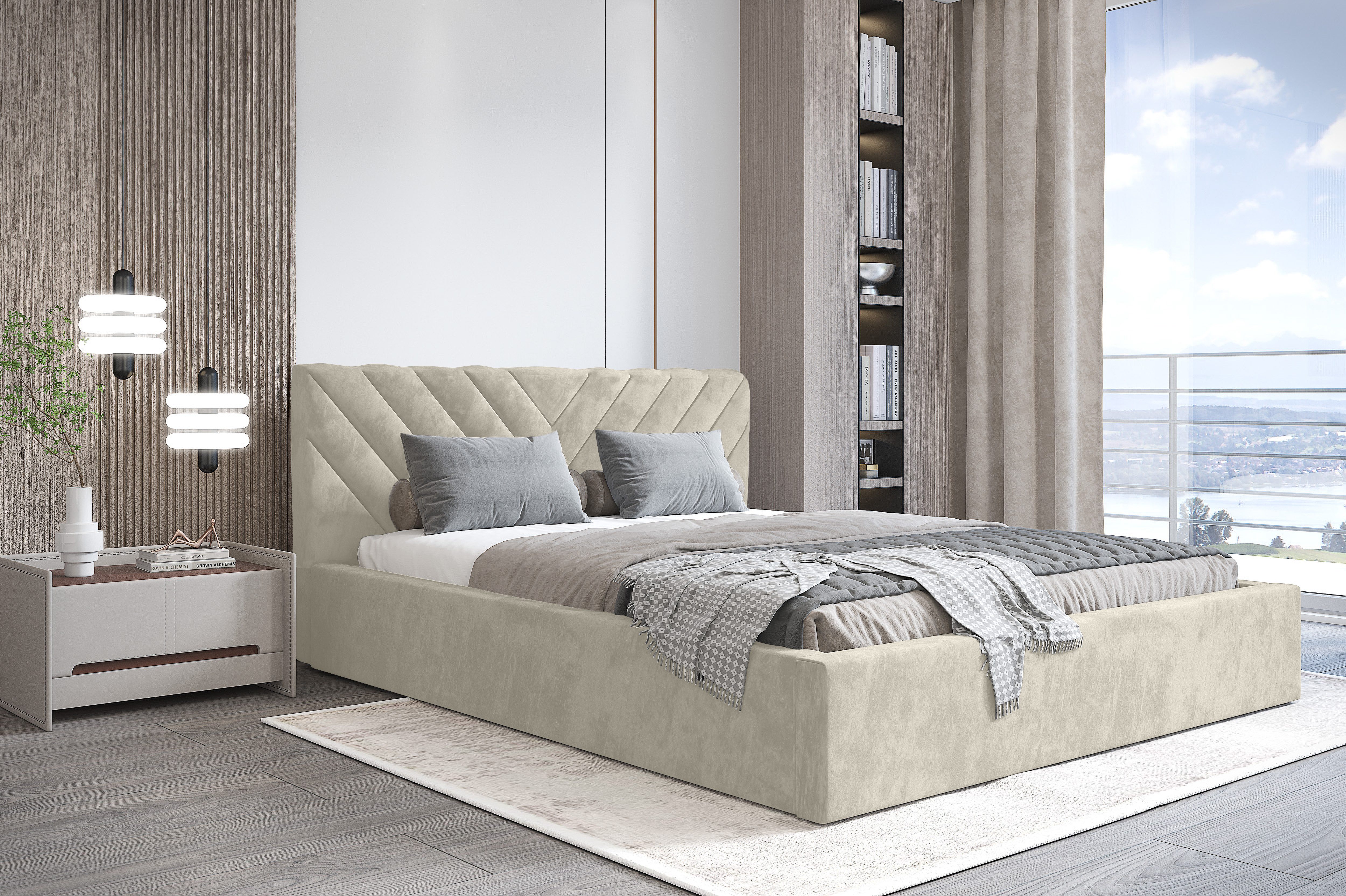 inkl. Bettkasten inkl. Holzlattenrost Widerstandsfähiger und angenehm zu berührender Stoff Kopfteil mit Steppung und gepolsterter Korpus ohne Matratze ohne Nachttisch
