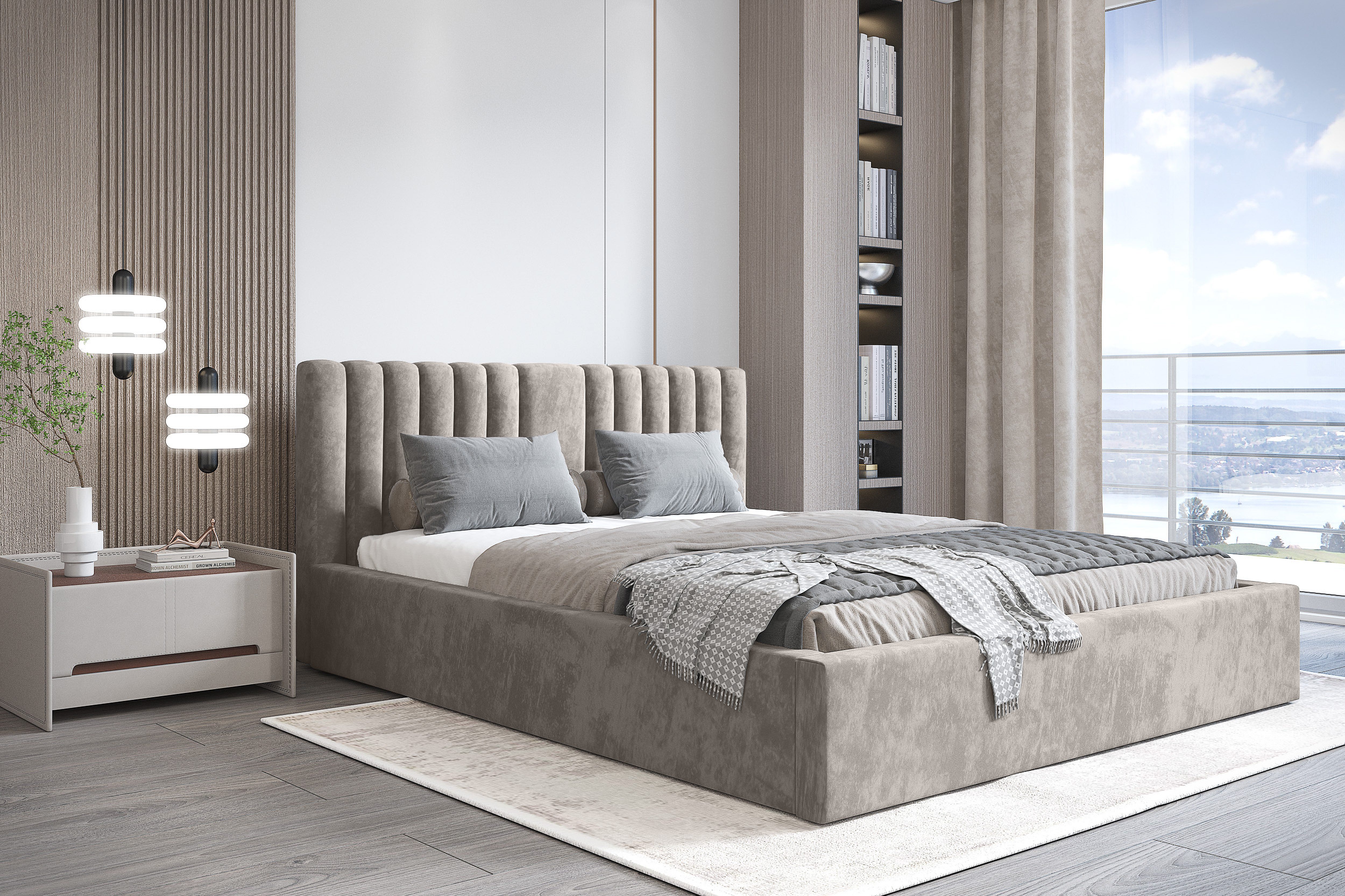 Das Bett Vegas VI ist ein Vorschlag für alle, die modernes Design und luxuriöse Verarbeitung schätzen. Das gesteppte Kopfteil mit geometrischem Muster verleiht dem Interieur einen einzigartigen Charakter, während der gepolsterte Rahmen die Eleganz des Möbels unterstreicht. Dank der Vielfalt an Stoffen und Farben lässt sich das Bett Vegas VI perfekt auf jeden Einrichtungsstil abstimmen. Die robuste Konstruktion sorgt für Stabilität und Nutzungskomfort, während der optionale Bettkasten ein funktionelles Raummanagement ermöglicht. Vegas VI verbindet Ästhetik mit Zweckmäßigkeit und schafft so den perfekten Ort für Ruhe und Entspannung.