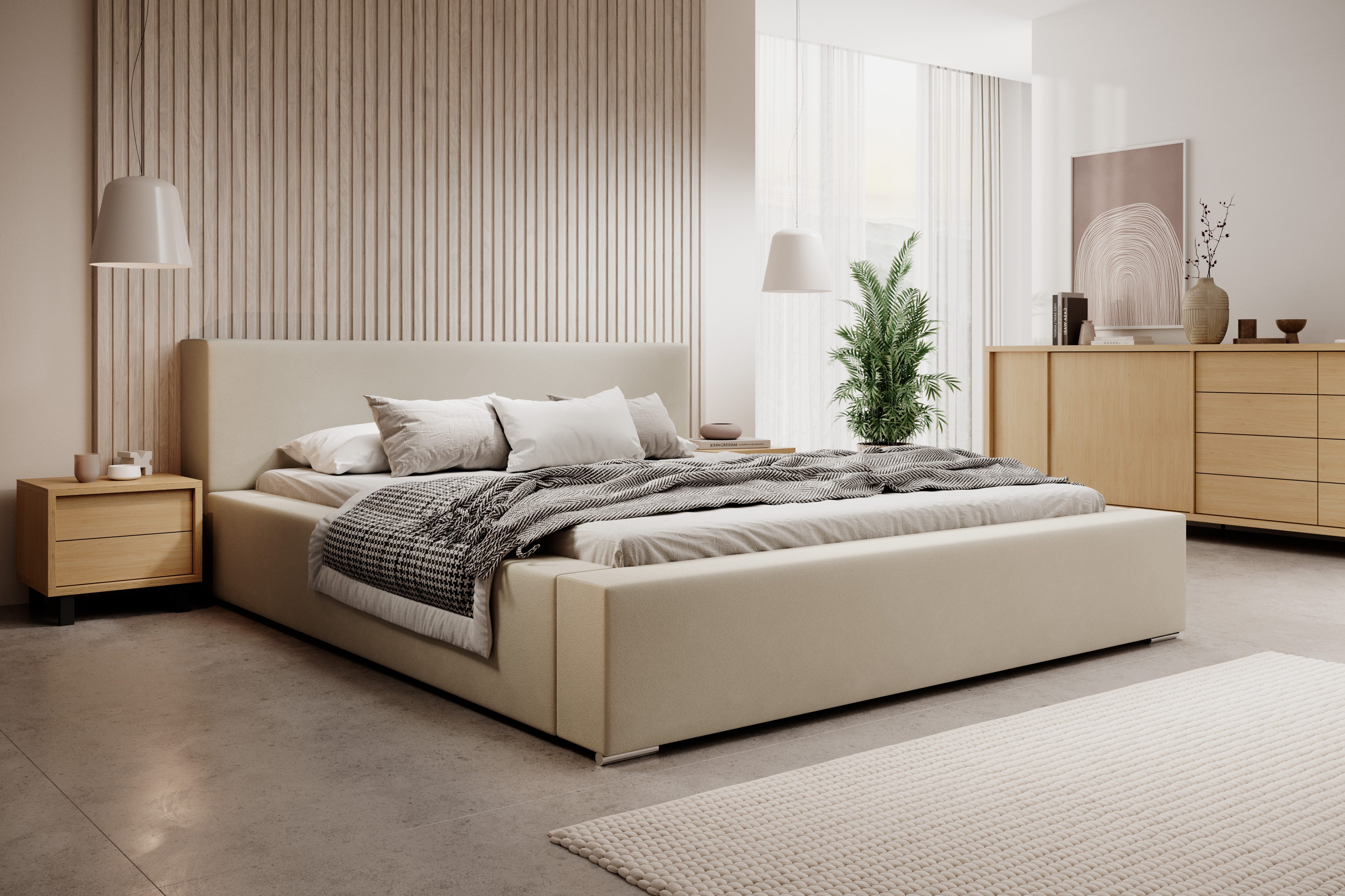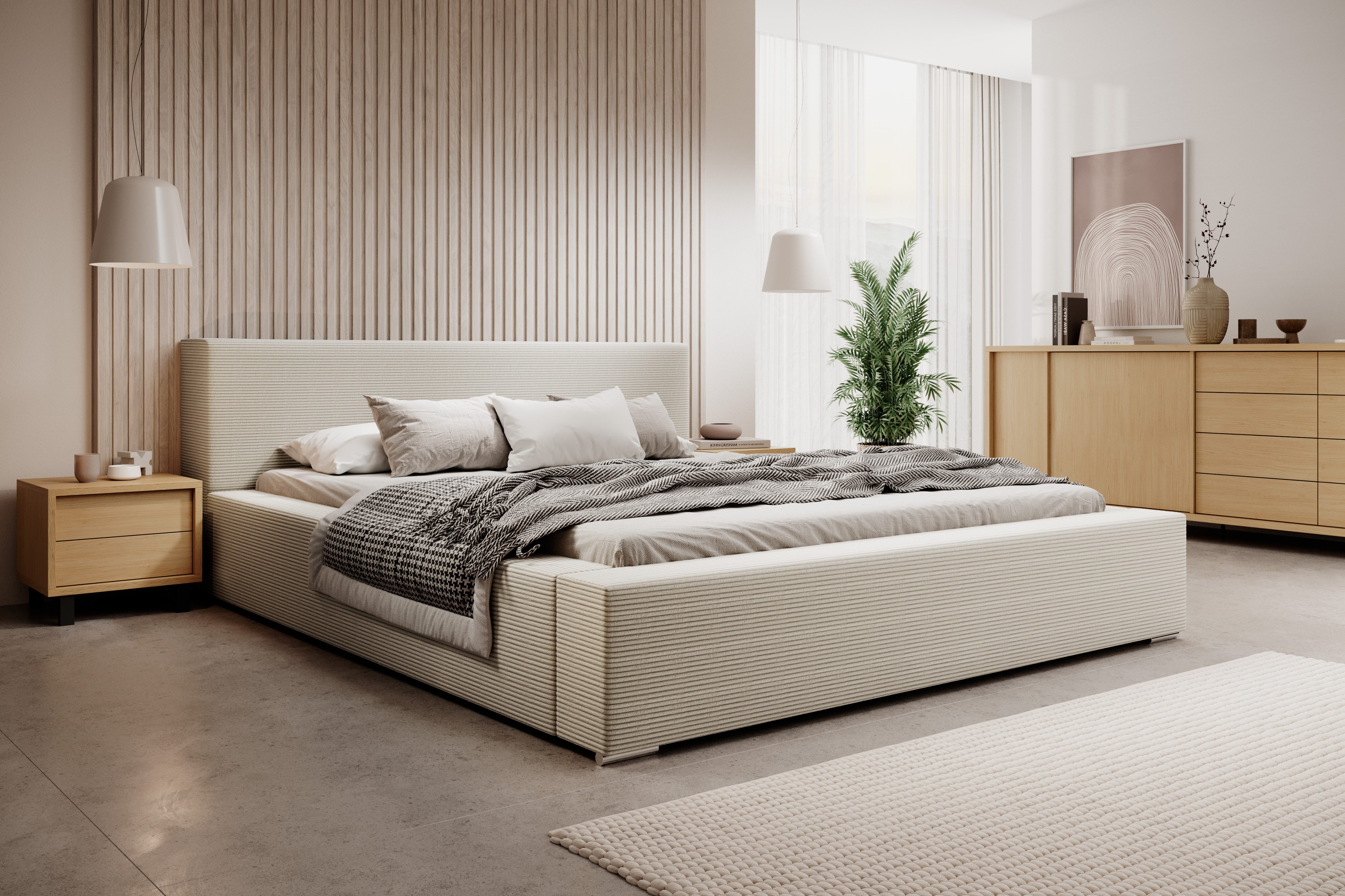 inkl. Bettkasten inkl. Holzlattenrost Widerstandsfähiger und angenehm zu berührender Stoff Kopfteil mit Steppung und gepolsterter Korpus ohne Matratze ohne Nachttisch