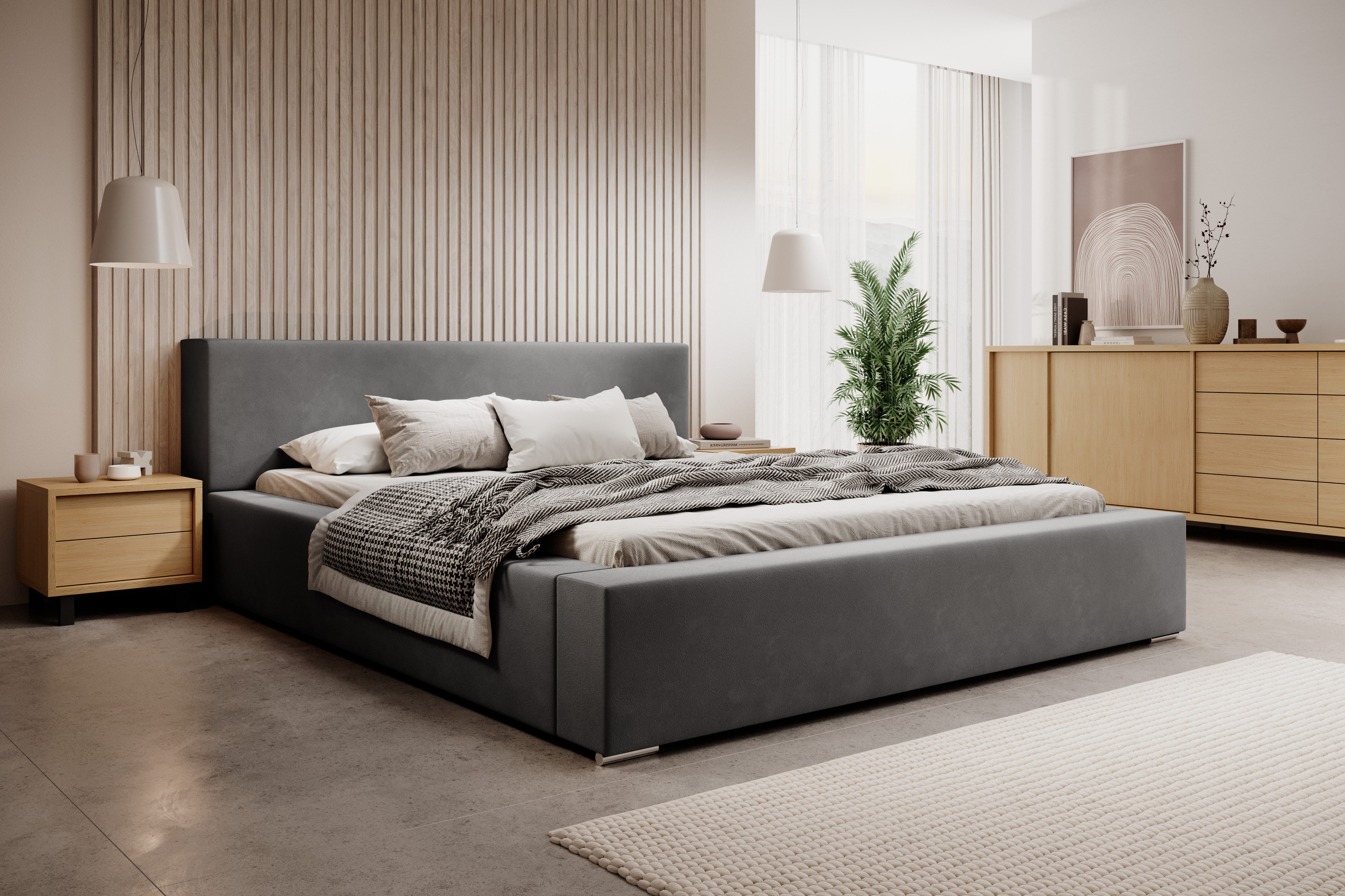 Das Bett Verona ist die perfekte Wahl für Liebhaber moderner und funktionaler Lösungen im Schlafzimmer. Sein minimalistisches Design fügt sich harmonisch in moderne sowie klassische Innenräume ein. Der stabile, solide Rahmen sorgt für Langlebigkeit und garantiert Komfort und Bequemlichkeit für viele Jahre. Dank des geräumigen Bettkastens unter der gesamten Liegefläche bietet das Bett Verona zusätzlichen Stauraum für Bettwäsche, Decken oder andere Gegenstände und erleichtert so die Organisation im Schlafzimmer. Eine praktische Lösung, die gleichzeitig Platz spart. Der Lattenrost aus 32 robusten Holzlatten sorgt für optimale Unterstützung jeder Matratze und garantiert einen erholsamen und gesunden Schlaf. Das Bett überzeugt nicht nur durch seine Ästhetik, sondern auch durch seine außergewöhnliche Funktionalität, was es zum idealen Möbelstück für jedes Schlafzimmer macht.