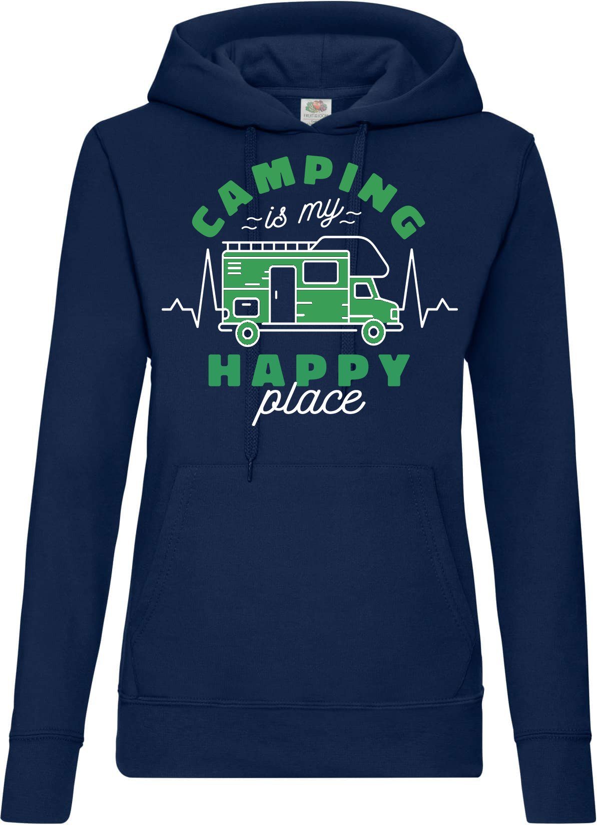 Hochwertiger Hoodie für Damen mit lustigem CampingVan Motiv im Wald und Spruch für Camper, Wanderer, Zeltler und Abentuerer.