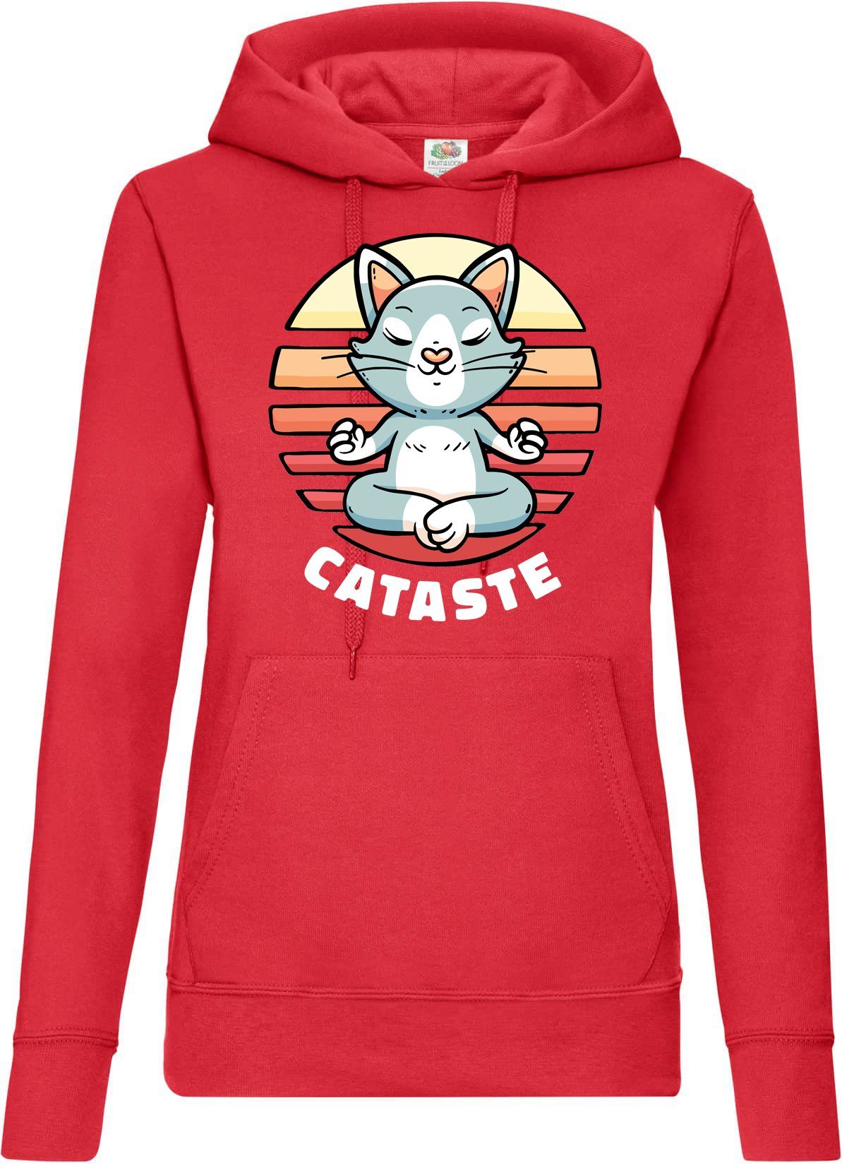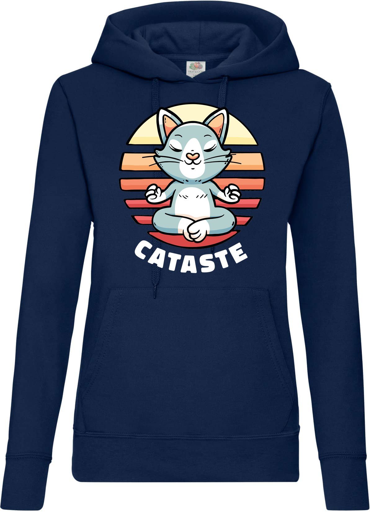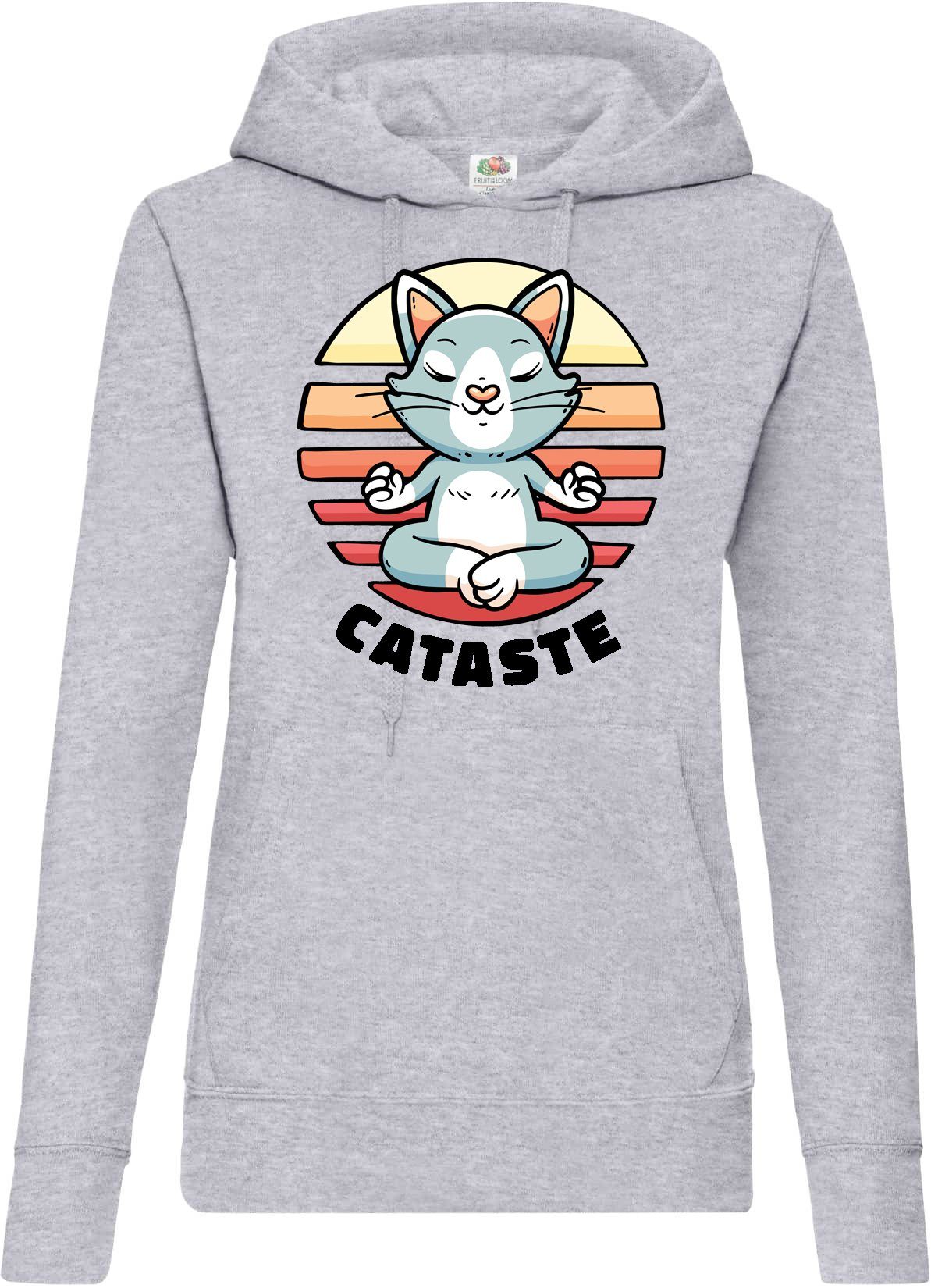 Hochwertiger Hoodie mit meditierender Katze Print und lustigem Cataste Namaste Spruch für alle Yoga Fans und Tier Freunde