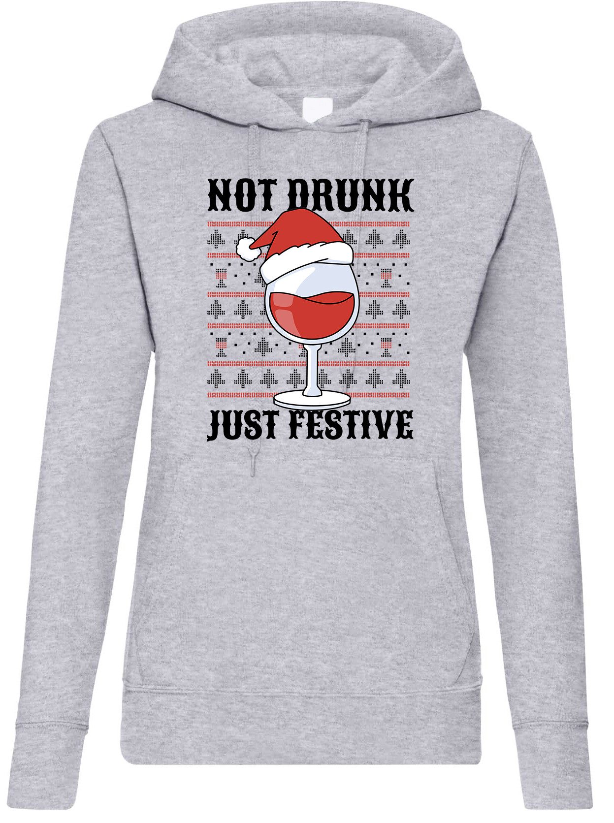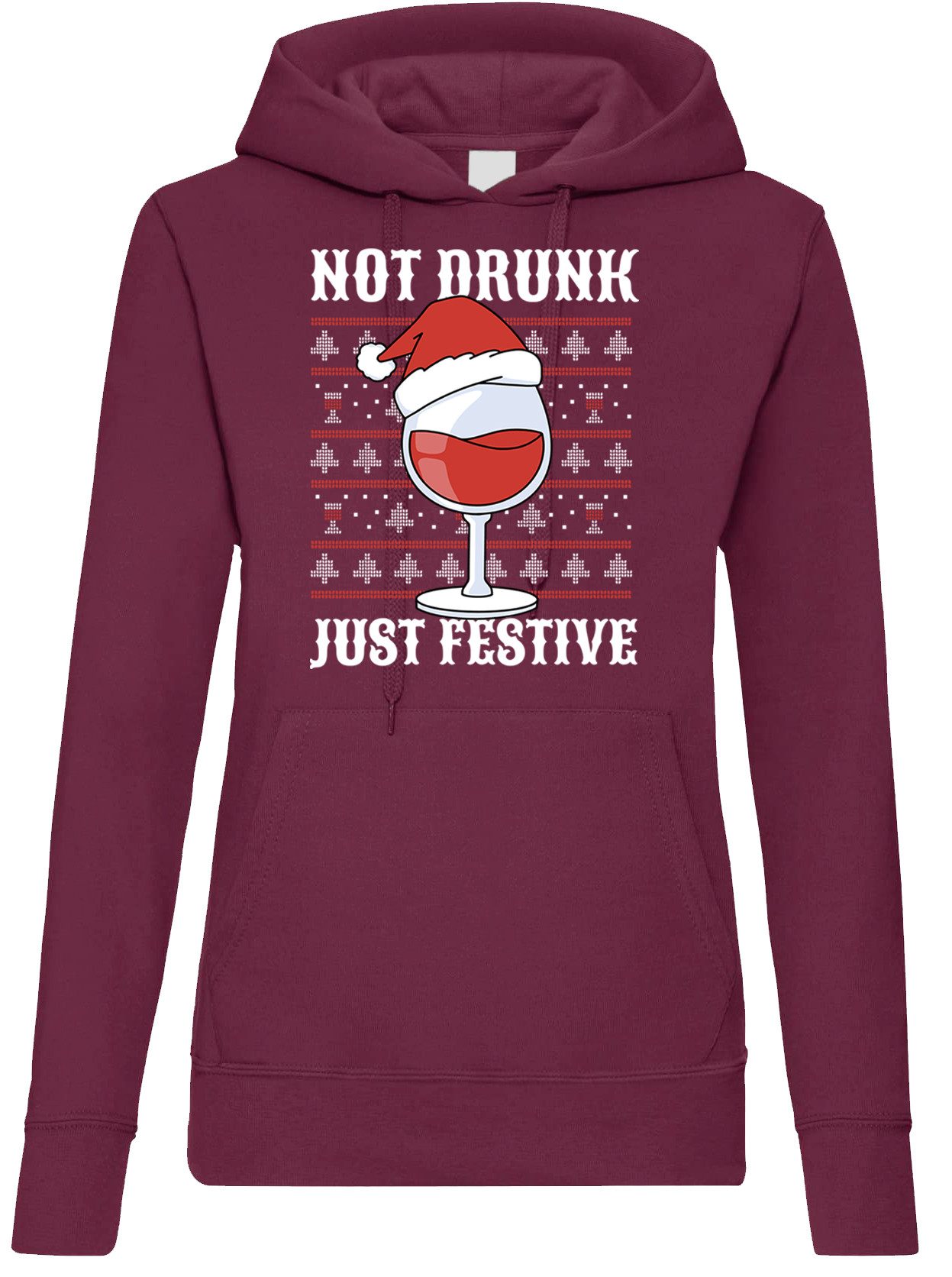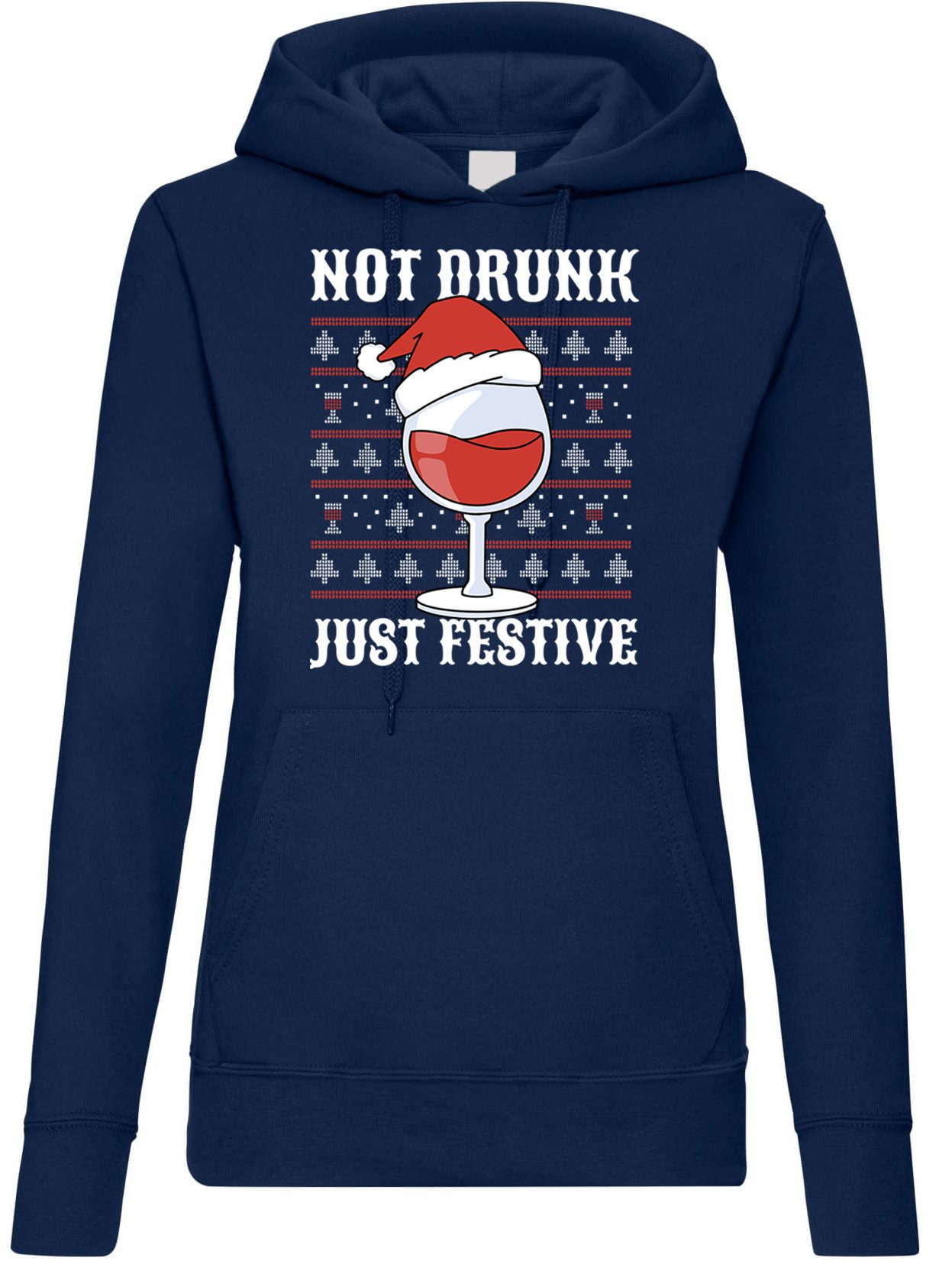 Festlicher Spruch: Der coole Aufdruck "Not Drunk, Just Festive" bringt humorvolle Weihnachtsstimmung in jedes Outfit. Perfekt für Wein-Liebhaber und Weihnachten-Fans!