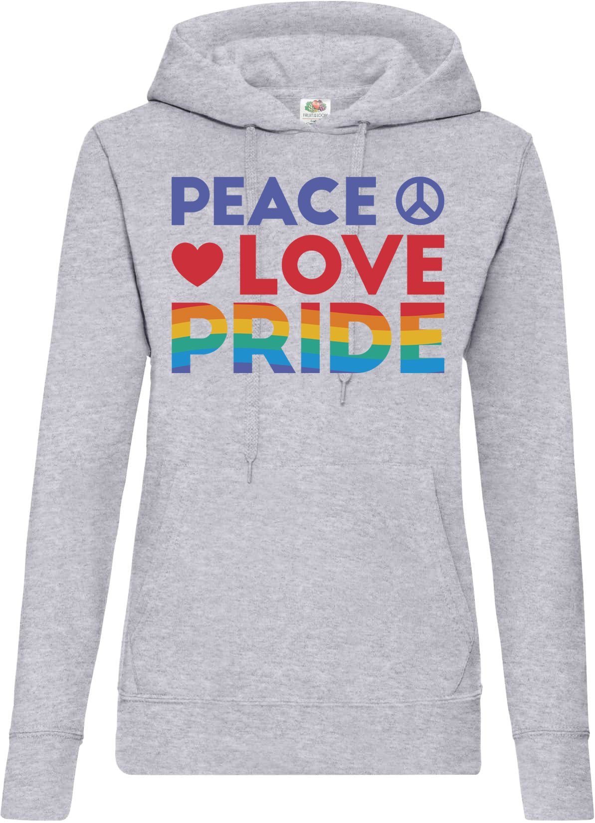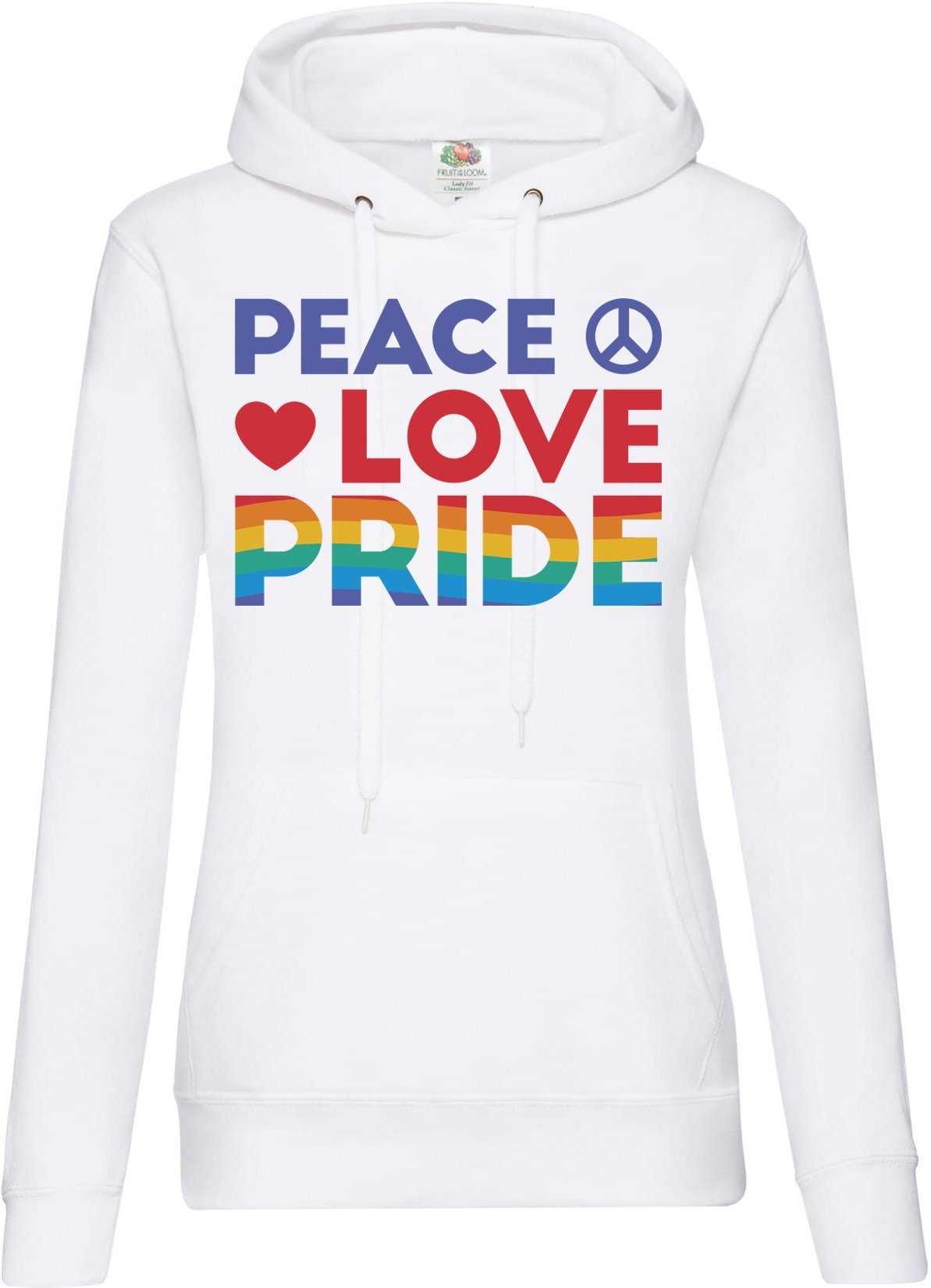 Modischer Damen Kapuzenpullover mit hochwertigem Aufdruck, weichem Innenfutter, Kordelzügen, Bauchtasche und gerippten Bündchen an Ärmel und Saum.