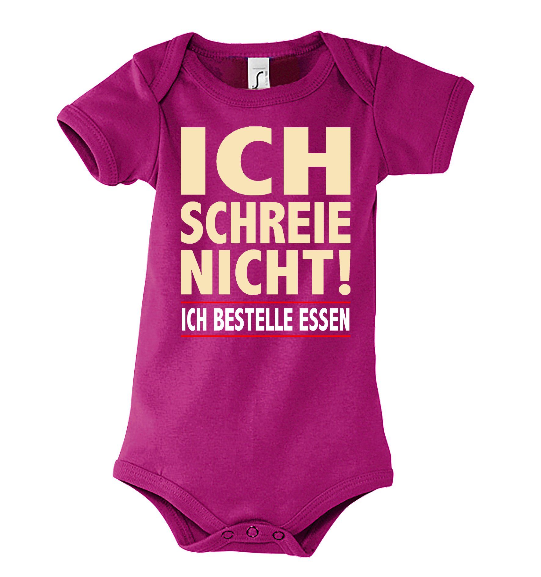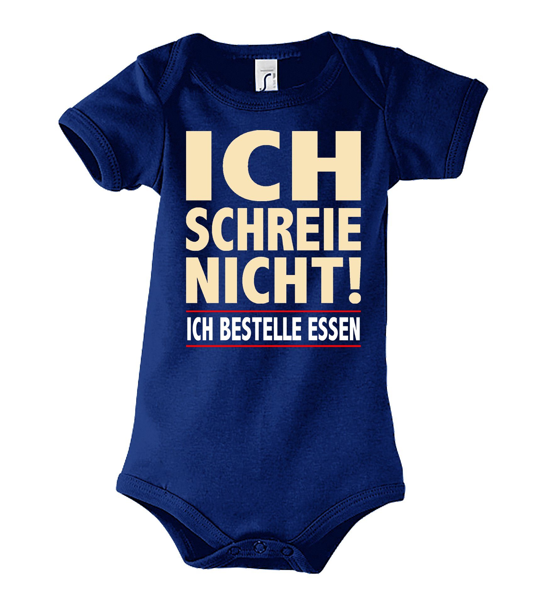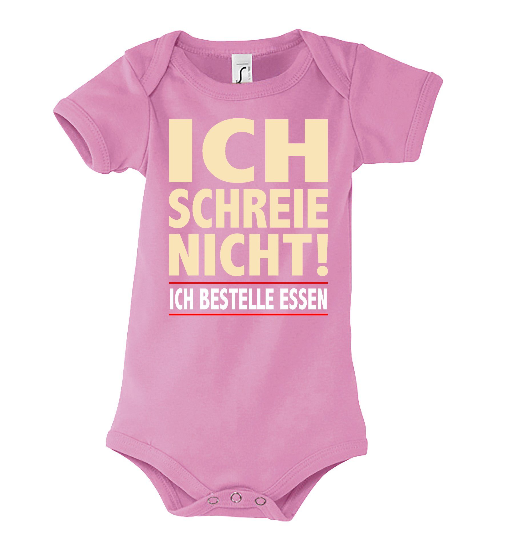 Kurzarm Baby Strampler mit lustigen Spruch Logo Aufdruck: ICH SCHREIE NICHT - ICH BESTELLE ESSEN Schriftzug