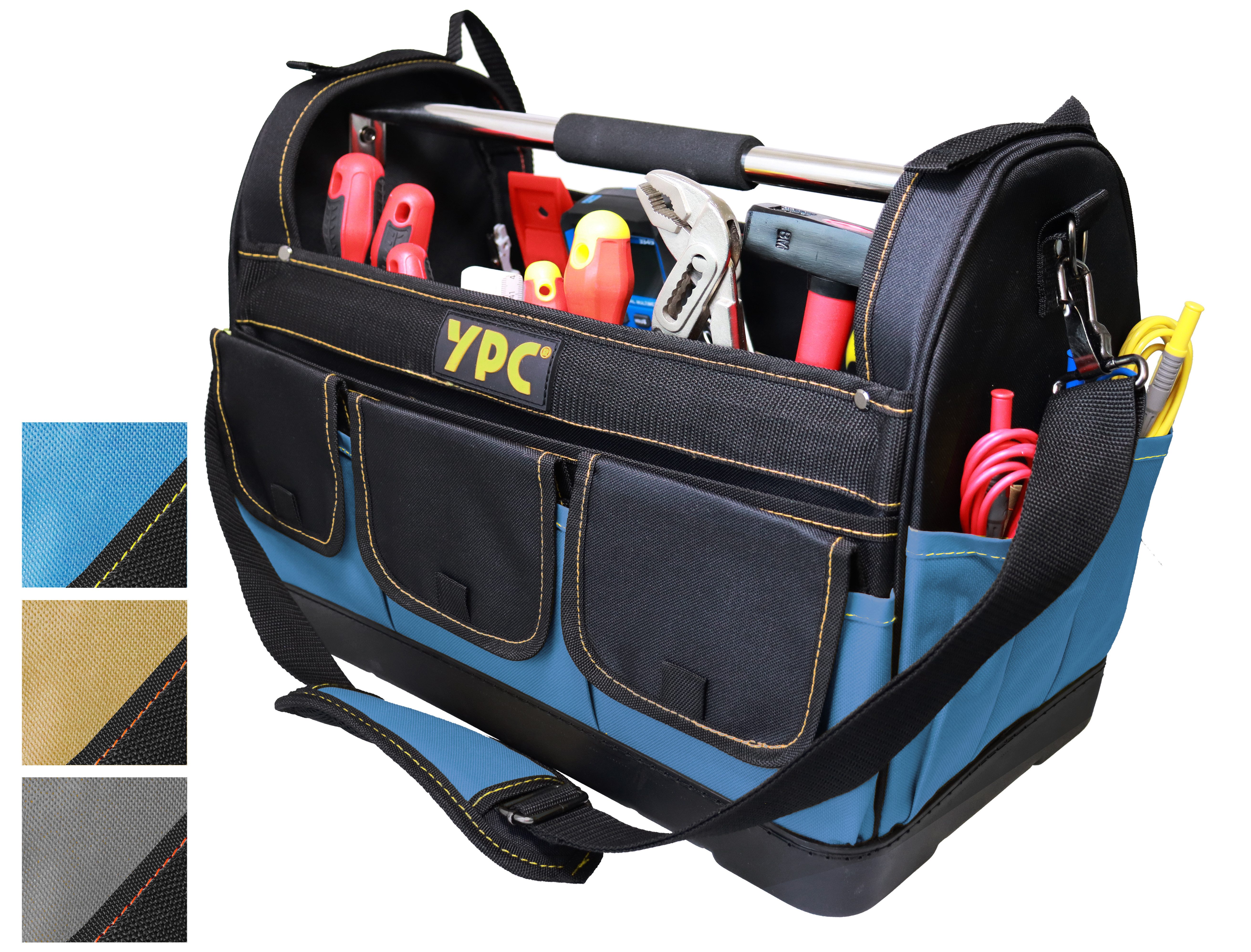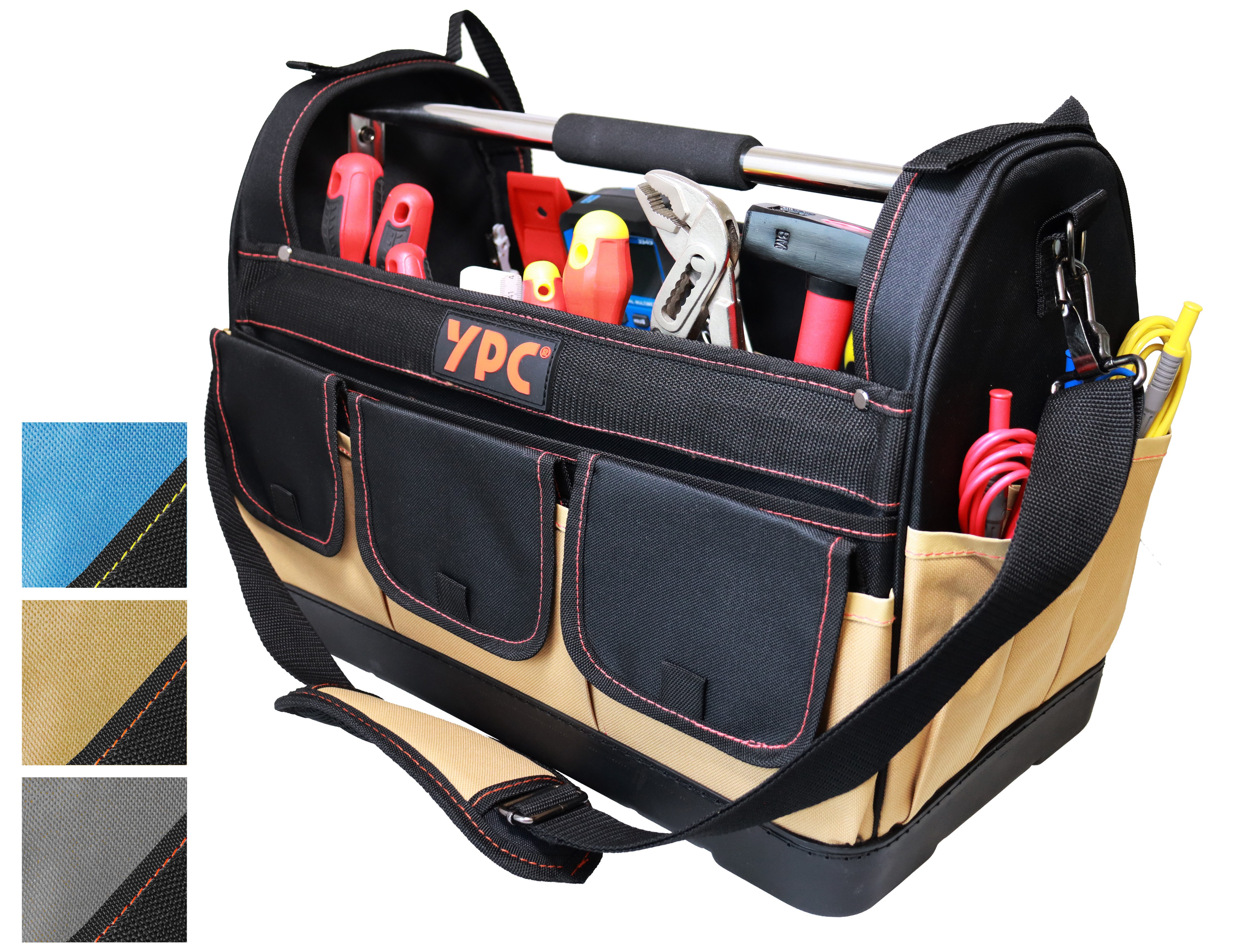 Die äußerst große, offene "Pioneer" Werkzeugtasche wurde aus reißfestem, wasserabweisenden Oxford 600DGewebe gefertigt und verfügt über vielen Werkzeughalterungen und Aufgesetzte Taschen für den Schnellzugriff auf Werkzeug und Arbeitsmaterial im täglichen Einsatz bei der Installation auf der Baustelle oder im Wartungs-/und Service bereich. Auf der Außenseite befinden sich sechs offene und fünf große, geschlossene Taschen für Schraubenschlüssel, Bitsatz, Maßband, Zangen oder sonstige Werkzeuge. Innenseitig befinden sich acht Schraubendreherschlaufen und vier große Innentaschen sowie die große Tasche mit 45x23x20cm für Material. Die Tasche lässt sich bequem per Metall-Tragegriff oder gepolstertem Schultergurt transportieren.