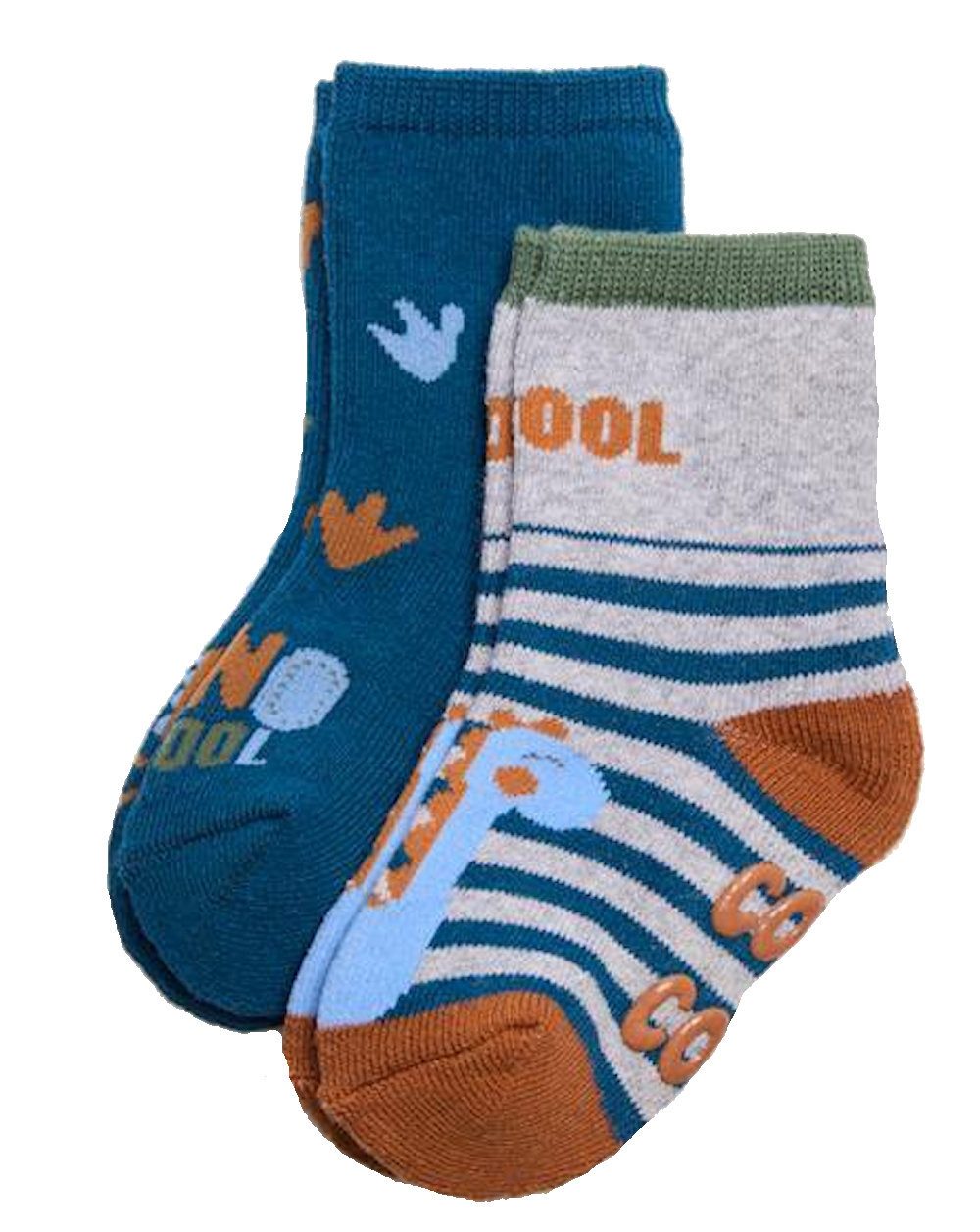 2er Pack Baby Thermo Strümpfe Stoppersocken Dino blau grau Ringel von Ysabel Mora Antirutsch Strümpfe mit Komfortbund für den Winter - 1x blau, 1x grau Ringel mit Dinosaurier Motiv, Strümpfe für gute Laune