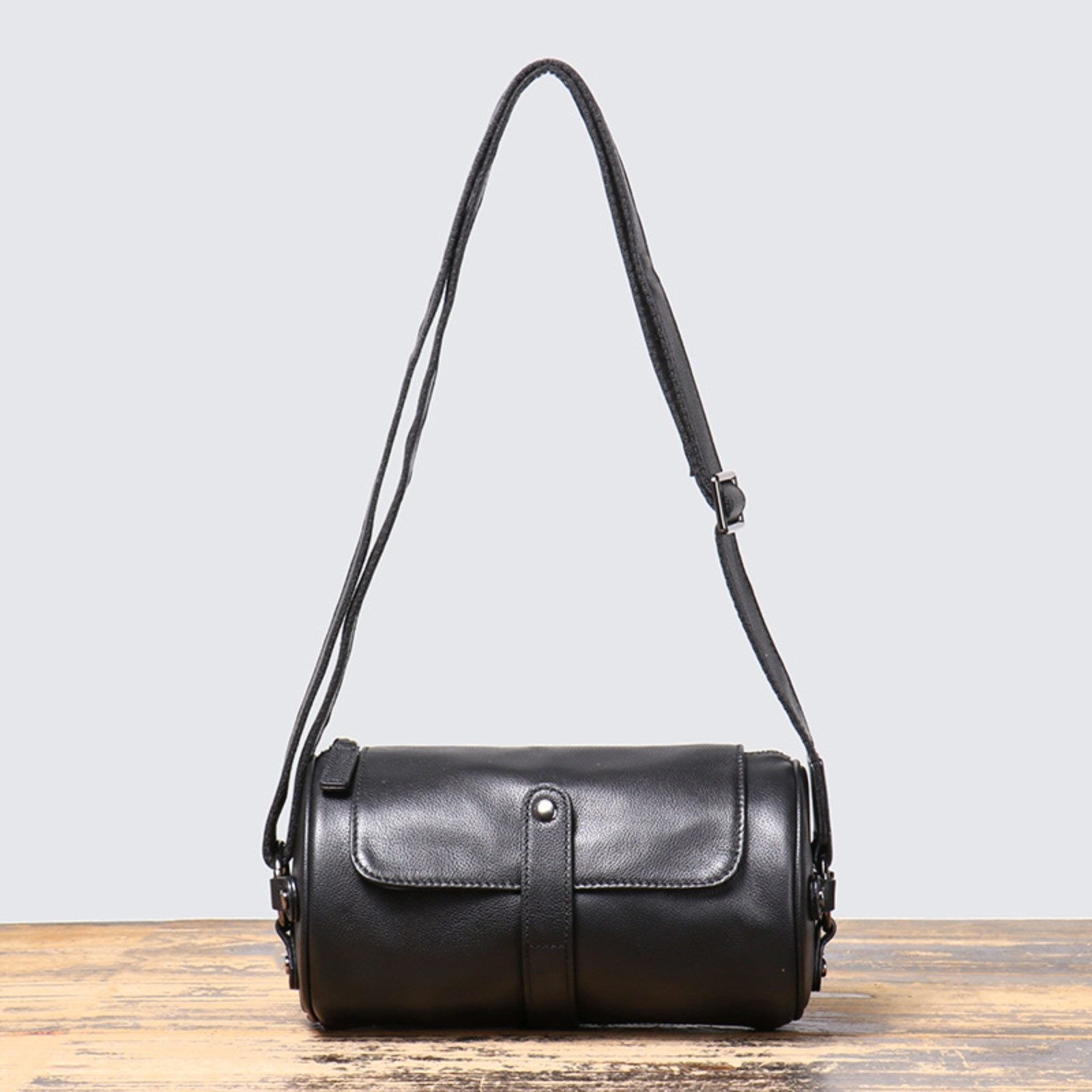 Kompakte Herren-Umhängetasche im Fass-Design, aus hochwertigem schwarzem Echtleder. Bietet Platz für wichtige Dinge wie Powerbank und Regenschirm. Verstellbarer Schulterriemen für komfortables Tragen, ideal für den Alltag oder Reisen.