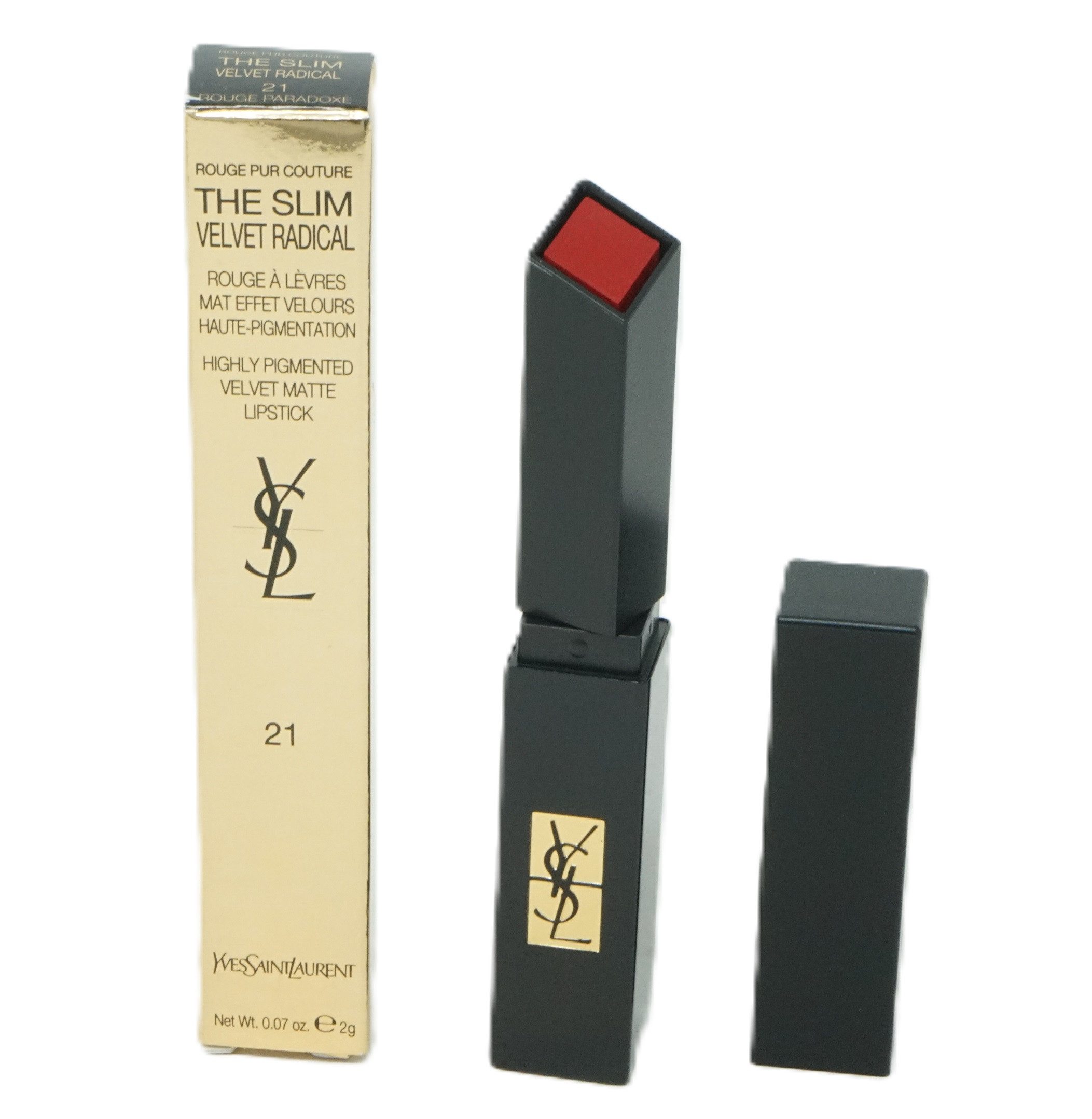 Yves Saint Laurent Rouge The Slim Velvet Matte 21 Rouge Paradoxe ist ein hochpigmentierter, luxuriöser Lippenstift mit einem intensiven, samtigen Matt-Finish Die leichte, cremige Formel gleitet sanft über die Lippen und sorgt für eine langanhaltende, volle Farbe, ohne die Lippen auszutrocknen Farbton 21 Rouge Paradoxe ist ein klassisches, kräftiges Rot, das für einen eleganten, zeitlosen Look sorgt