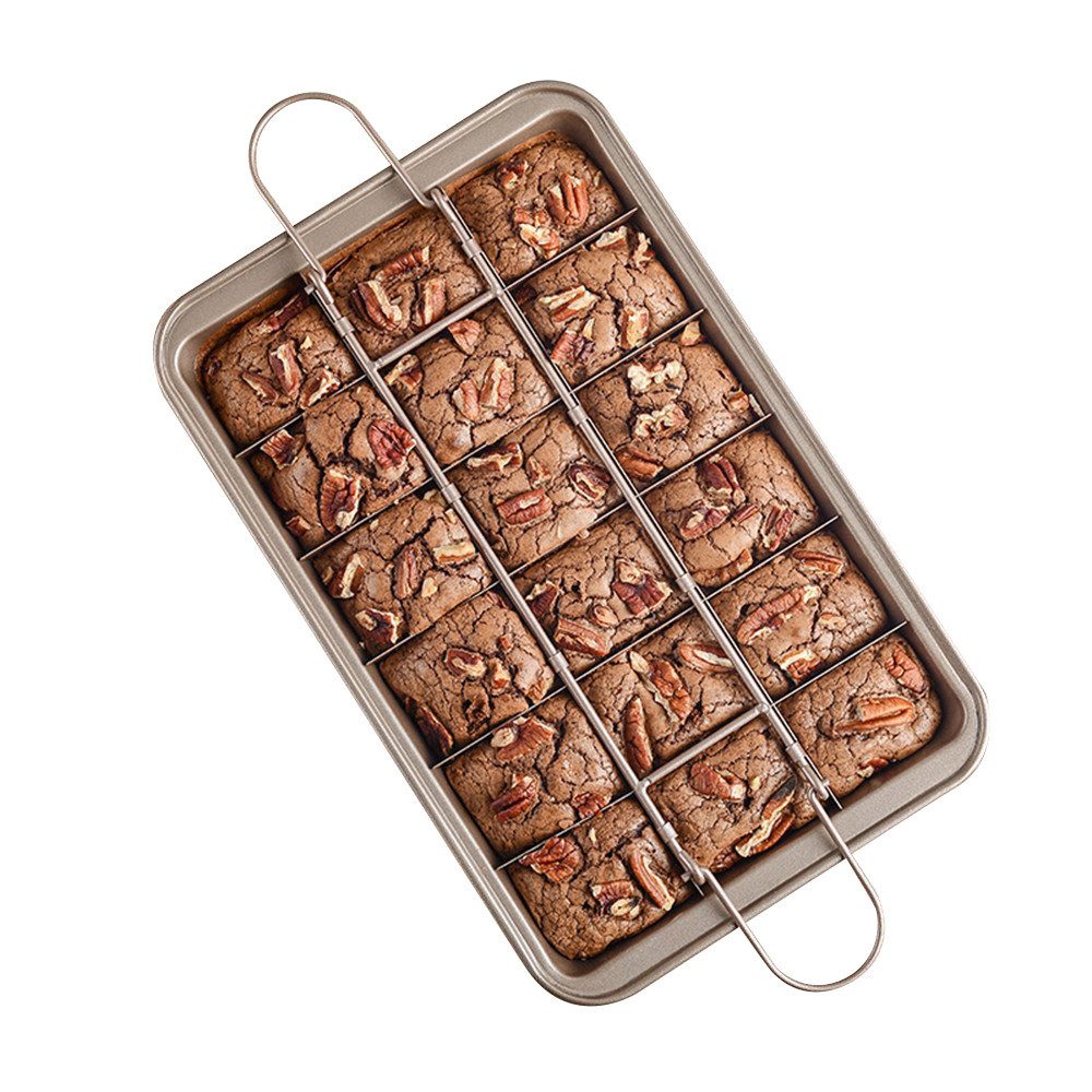 EINZIGARTIGES VORSCHNEIDENDES TEILER-DESIGN: Diese Brownie-Pfanne macht 18 gleichmäßig große Brownies auf einmal. Sie müssen nicht jedes Stück mit einem Messer schneiden. Setzen Sie einfach vor dem Backen die Teiler ein und verwenden Sie die Griffe, um die Kuchen/Brownies nach dem Abkühlen herauszuheben. Darüber hinaus können Sie 18 verschiedene Kuchen oder Gerichte in einer Form backen.