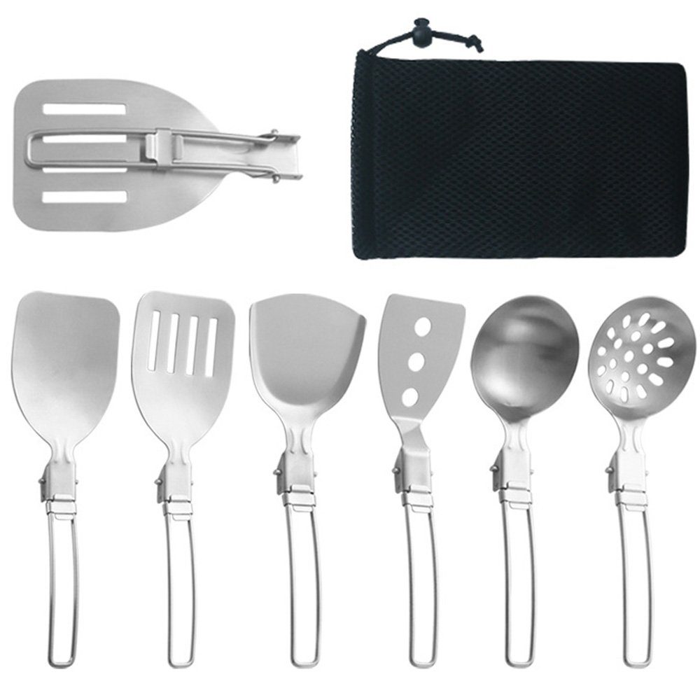 OUTDOOR COOKING UTENSIL SET 6 PIECES: Das robuste, klappbare Besteckset ist aus lebensmittelechtem Edelstahl gefertigt, korrosions- und hitzebeständig bis 800°C. Es rostet nicht, ist ungiftig und für den Langzeitgebrauch konzipiert.