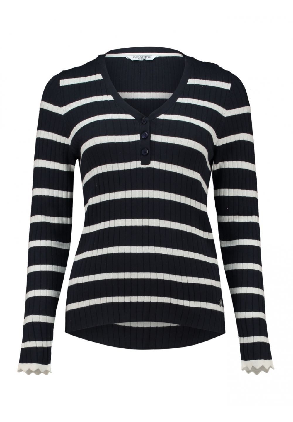 Hier kommt dein neuer Lieblingspullover Mit diesem leichten Strickpullover von ZABAIONE lassen sich schnell neue Styles zusammenstellen. Der Streifen-Look und der geköpfte V-Ausschnitt macht den Pullover individuell und peppig. Die langen Ärmel enden in einem Ripp-Rüschenstrickbündchen, das für guten Sitz sorgt. Dieser Pullover im maritimen Look ist kurz sowie schmal geschnitten, sodass er deine Silhouette schön betont. Der Strickstoff aus Viskosemischung und bietet hohen angenehmen Tragekomfort. Zeit für etwas bequemes — mit dem kuschligen Pulli von ZABAIONE!