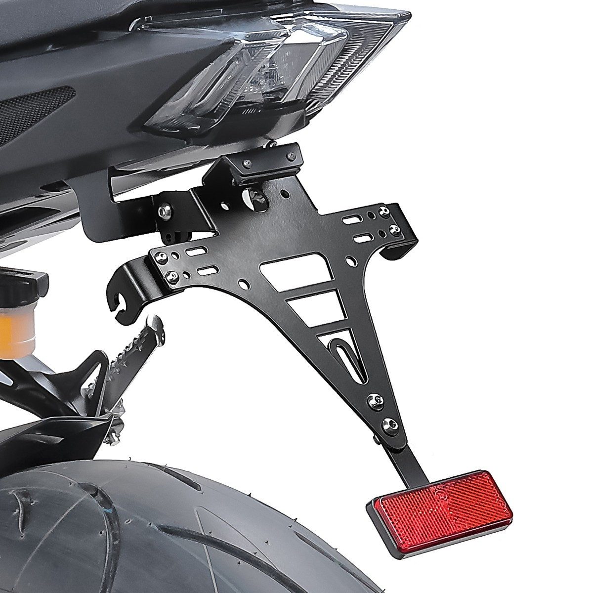 • Lieferumfang: Dreieck-Grundplatte zur Anbringung des Kennzeichens, modellspezifischer Anbausatz zur Montage am Motorrad, Reflektor (E-geprüft) mit Träger
