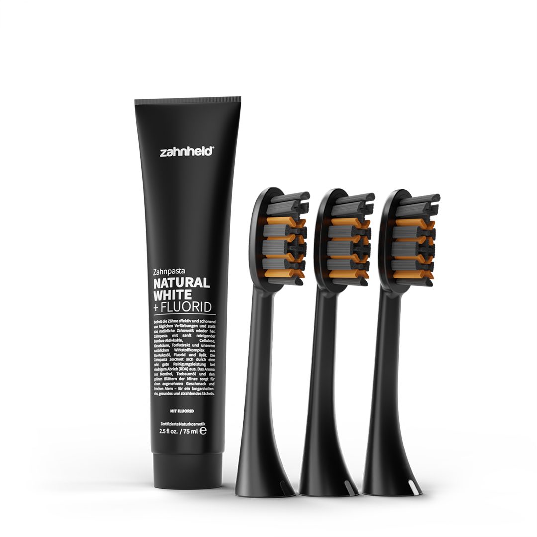 Mit der Kombination aus der Zahnheld Zahnpasta Natural White und dem Bürstenkopf Pro X-Clean hast du alles, was du für eine gründliche und zugleich sanfte Zahnpflege brauchst. Die Zahnpasta unterstützt die schonende Aufhellung der Zähne, ohne den Zahnschmelz zu beschädigen – dank ihres besonders niedrigen RDA-Werts von nur 13 ist sie auch ideal bei empfindlichen Zähnen. Natürliche Inhaltsstoffe wie Torfextrakt, Bambus-Aktivkohle, Kieselsäure und Cellulose helfen dabei, äußere Verfärbungen zu reduzieren und die natürliche Zahnfarbe zu betonen. Hyaluron und pflanzliches Glycerin pflegen zusätzlich das Zahnfleisch und sorgen für ein angenehmes Mundgefühl. Abgerundet wird das Ganze durch eine milde Minznote, die für frische sorgt – ganz ohne Schärfe.
