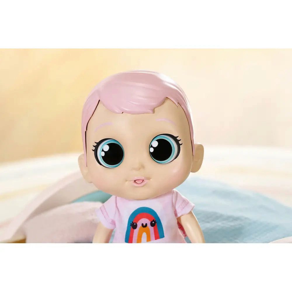 Das Puppenmädchen kann einfach nicht stillsitzen. Aufgeregt bewegt sie die Augen und wartet gespannt auf die nächste Runde Hoppe-Hoppe-Reiter. Und los geht’s… Wer kann diesen putzigen Kulleraugen schon widerstehen? Nach der lustigen Hopserei nuckelt die 30cm große Puppe hörbar an ihrem Fläschchen oder an ihrem Schnuller. So ein Spielspaß macht nicht nur durstig, sondern auch müde. Wenn die Kleine in den Schlaf gewiegt wird, tut sie ihre Wohlbehagen mit Gähnen und Schlafgeräuschen kund. Die witzige Einhornmütze dient dabei als Schlafmaske. Das Mädchen mit den rosa Haaren trägt ein Shirt mit Regenbogendruck und eine pinke Hose mit putzigen Tupfen. Zur Markteinführung enthält das Set zusätzlich einen limitierten Schlafanzug im Leoparden-Style. Chou Chou Markenspielpuppe. Im Cartoon-Style. 30cm groß. Mit großen Kulleraugen. Mit putzigen Funktionen und witzigen Sounds. Batterien erforderlich (nicht im Lieferumfang enthalten). Chou Chou Girl pink 30cm Limited Edition mit Shirt, Hose, Mütze und limitiertem Strampler. Inklusive Flasche und Schnuller.