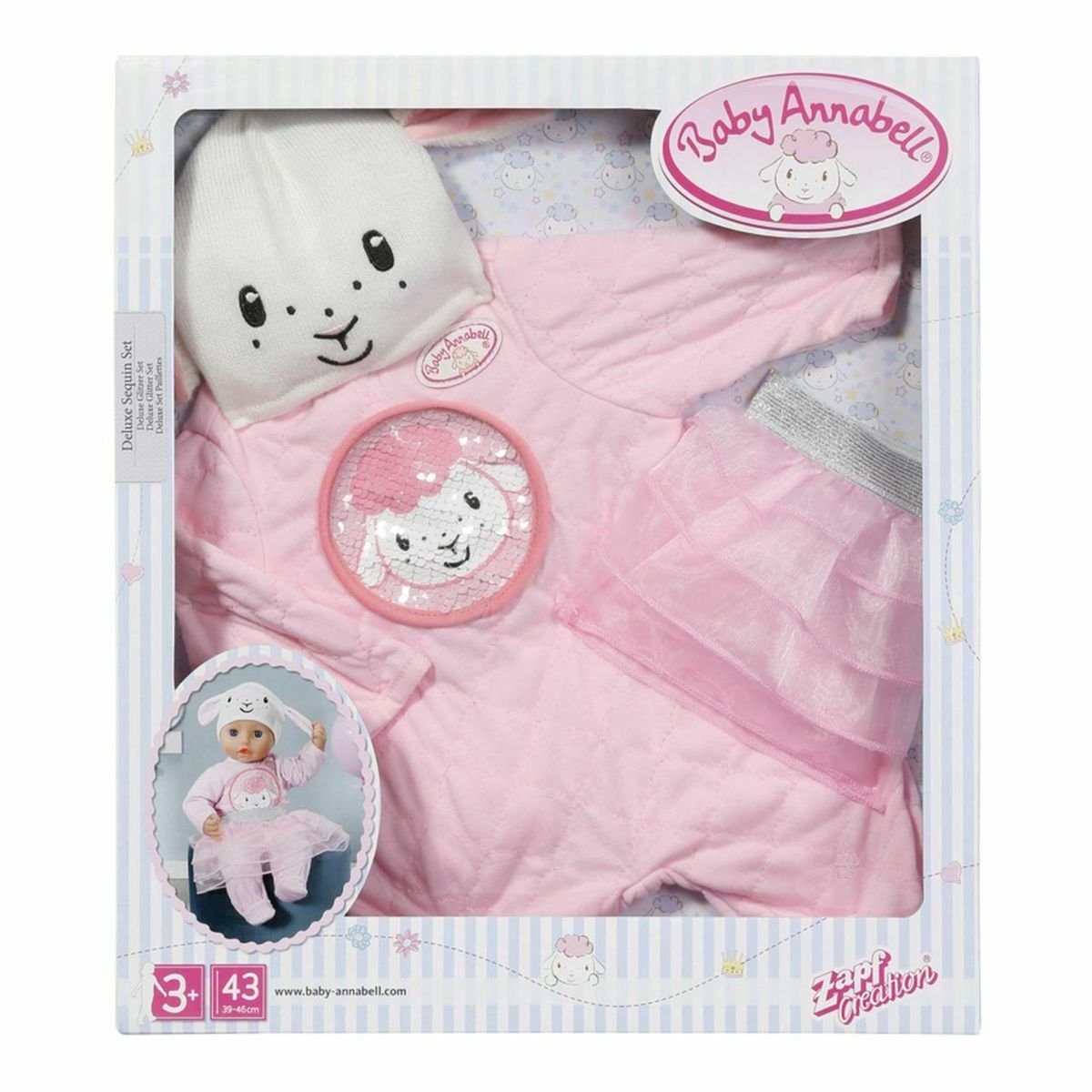 Süßes Schäffchen-Set für deine Baby Annabell Puppe (43cm). Der Strampler mit Pailletten, einem mehrlagigen Rock und die Mütze mit Schäfsöhrchen sind so süß wie rosa Zuckerwatte.
