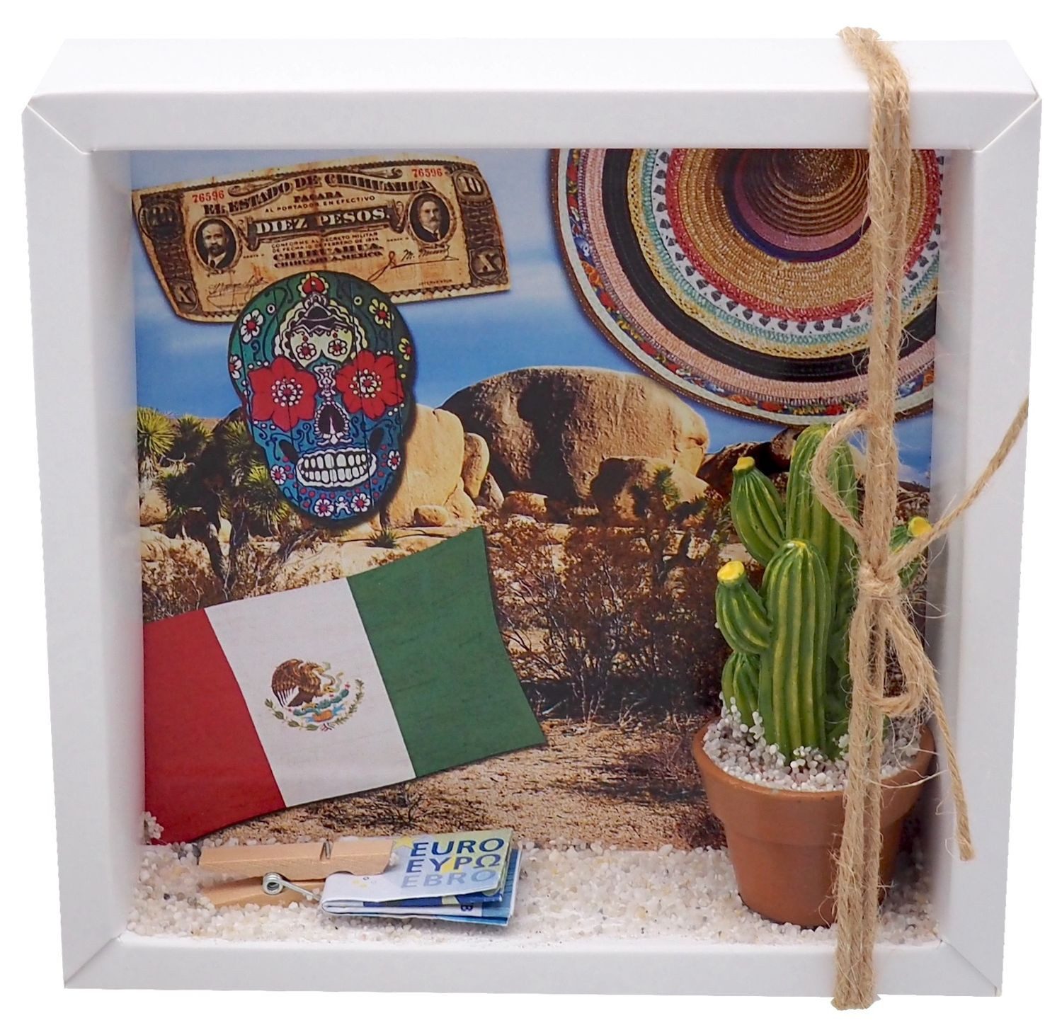 Inhalt: Ein auf Papier gedrucktes Hintergrundbild mit mexikanischen Motiven, ein künstl. Kaktus im Topf, Sand und eine Holzklammer zum befestigen des Geldscheines.