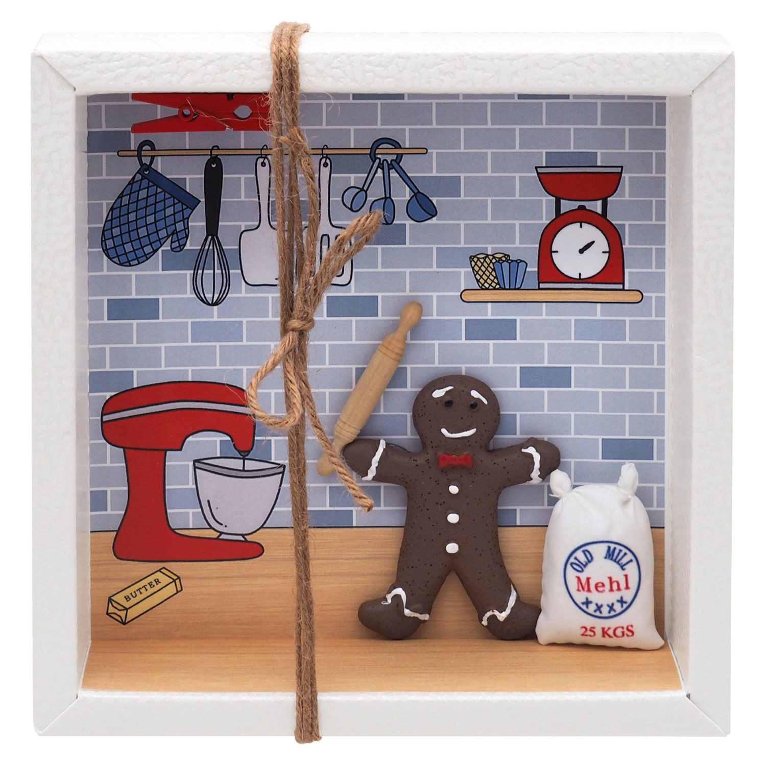 Inhalt: Ein kleiner Deko-Lebkuchenmann, ein kleiner Deko-Mehlsack, ein kleines Nudelholz, ein auf Papier gedrucktes Hintergrundbild mit Motiv Küche mit Backzubehör und eine kleine rote Holzklammer.