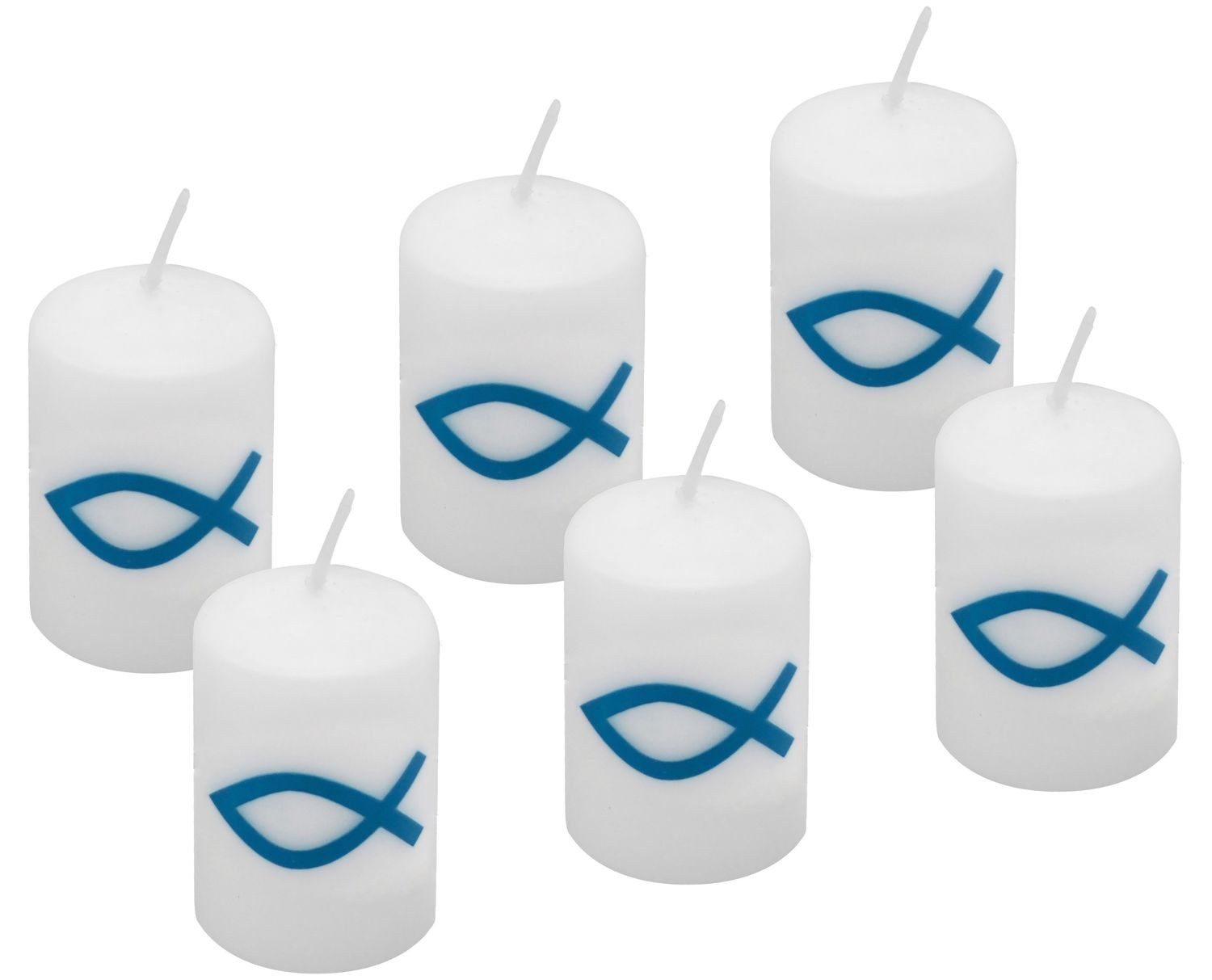 6 weiße Votivkerzen bedruckt mit einem Fisch in Petrol.