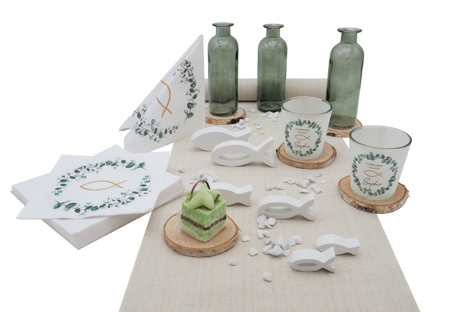 Die Vasen im Trendfarbton passen hervorragend zu den Motivservietten, die das religiöse Symbol des Fisches umrahmt von Eukalyptuszweigen auf moderne Weise interpretieren.