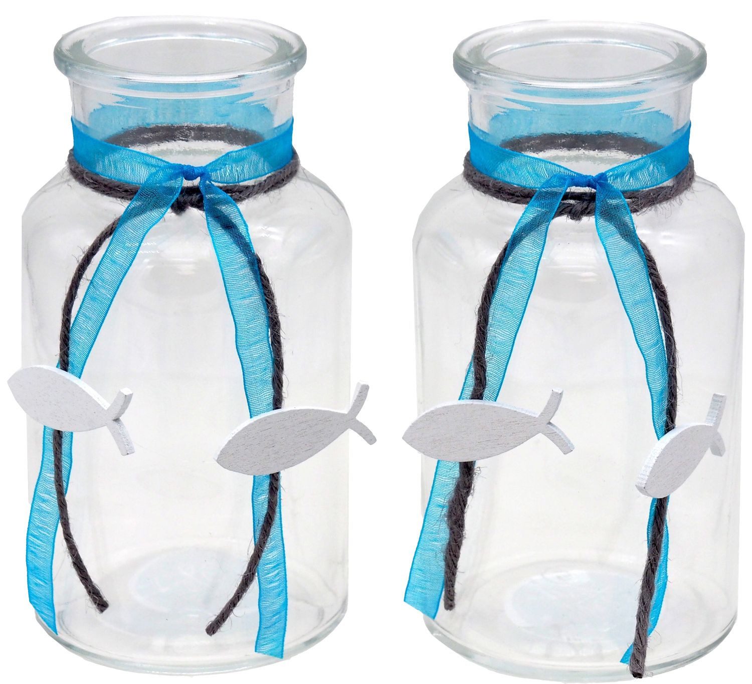 Verziert mit Kordel in Grau, Organzaband in Türkis und zwei kleinen Holzfischen in Weiß.