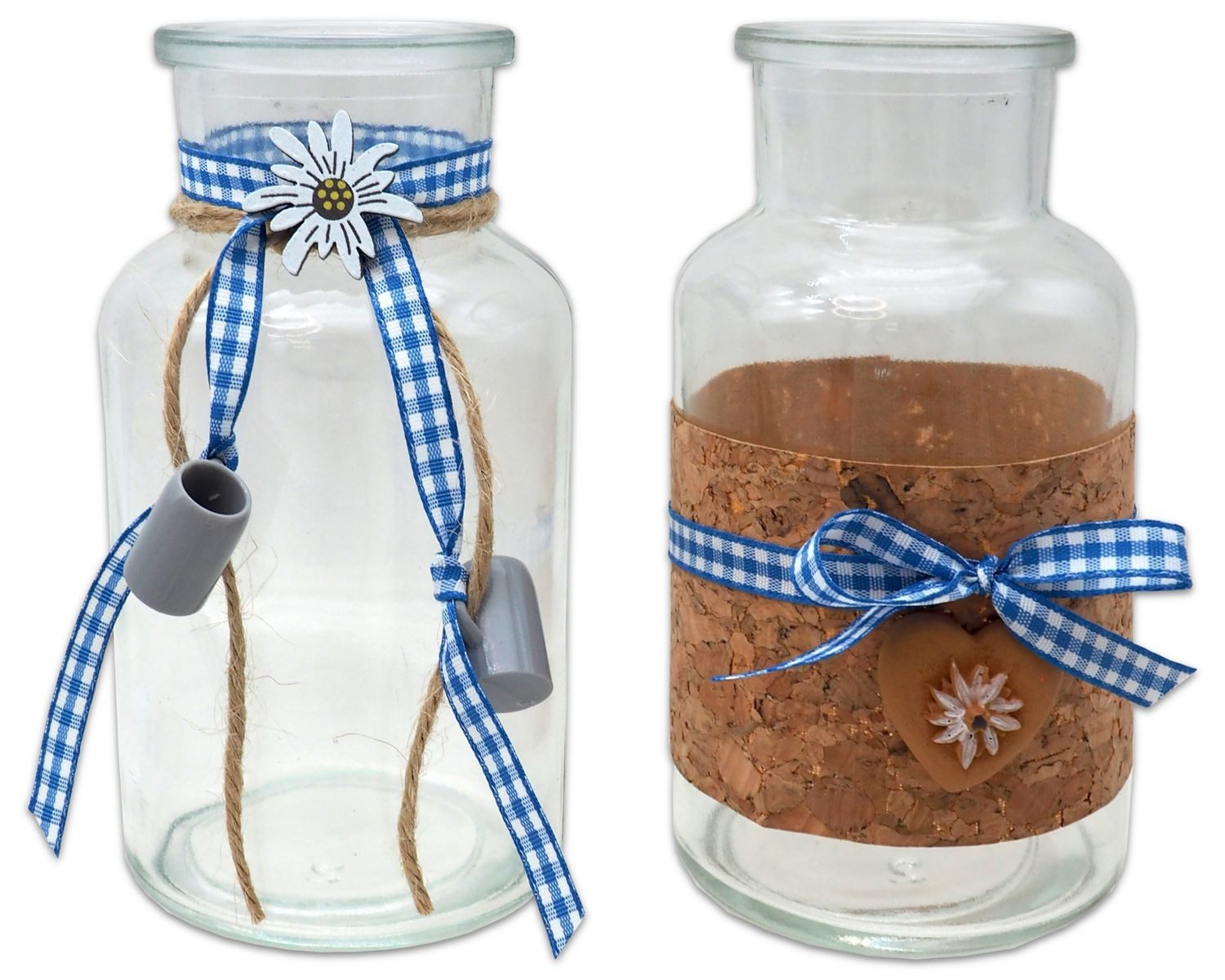 Eine Vase dekoriert mit Naturkordel, blau-weißem Karoband, zwei Maas und einem Edelweiß.