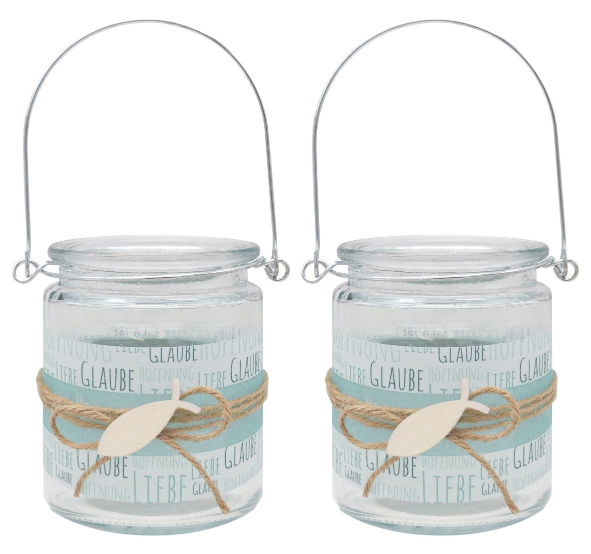 Zwei Windlichter aus Glas mit Metall Henkel und mit Banderole in Hellblau, Beschriftet mit "Glaube, Liebe und Hoffnung". Umwickelt mit einer Naturkordel und mit einem weißen Holzfisch dekoriert.
