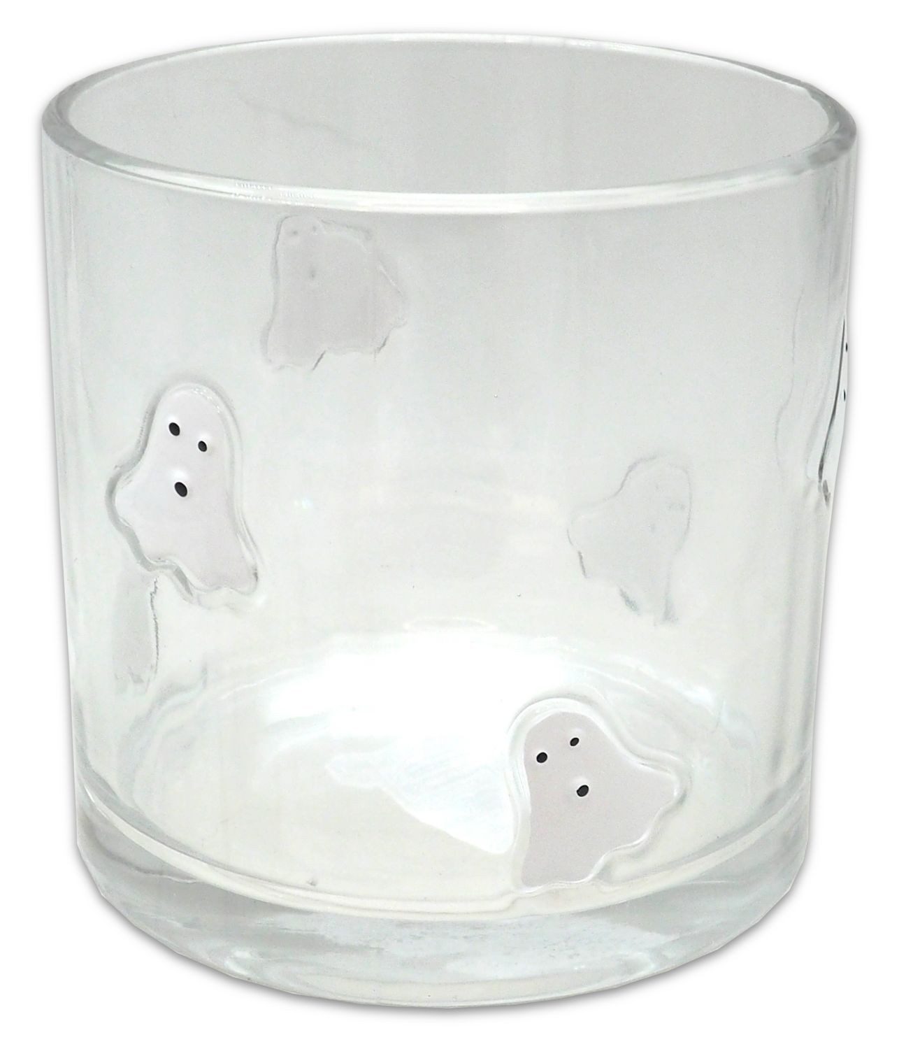 Ein Windlicht aus Glas mit weißen Gespenstern bemalt