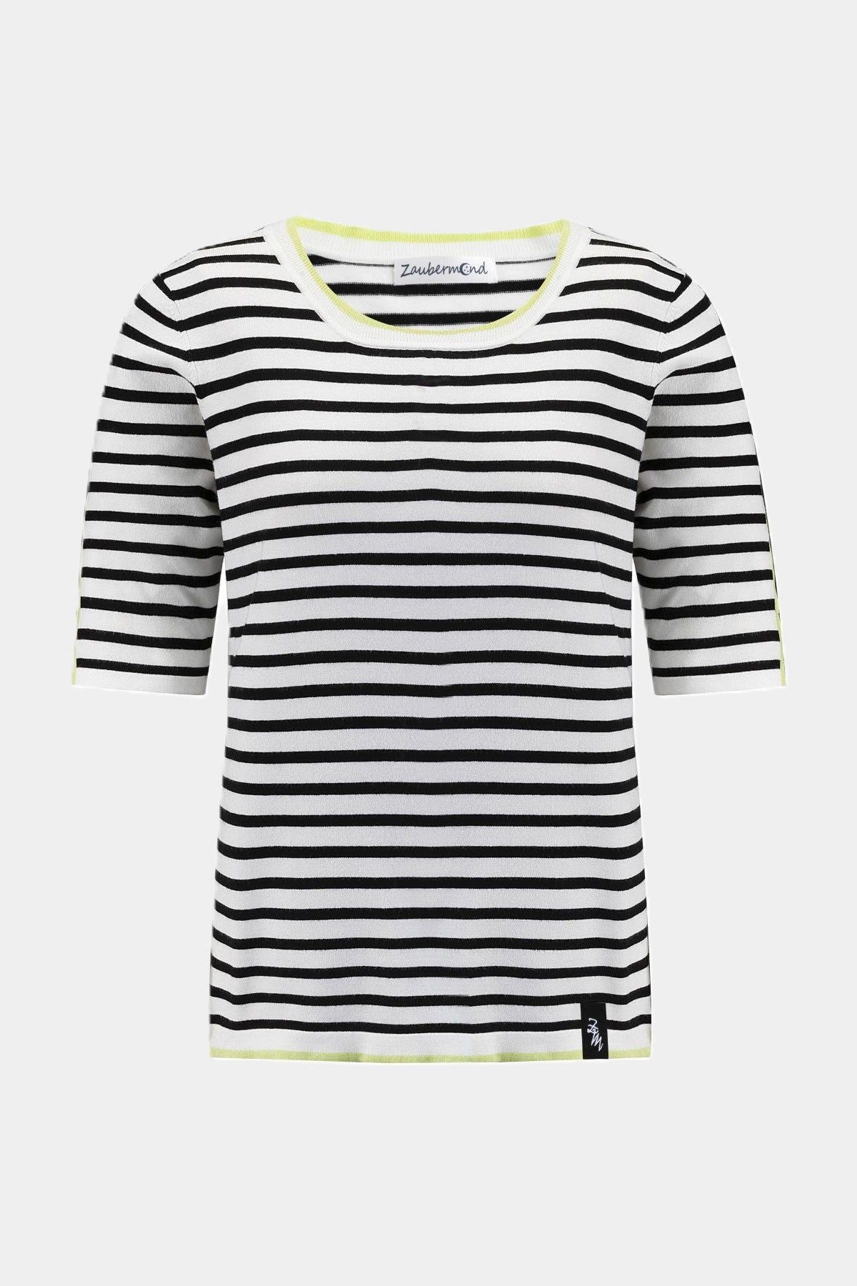 Dieses gestreifte Kurzarmshirt in Schwarz-Weiß kombiniert zeitlosen Stil mit angenehmem Tragekomfort. Die klassische Ringel-Optik sorgt für einen modernen, maritimen Look, während die feinen Neon-Details an Saum und Kragen für einen frischen Akzent sorgen.