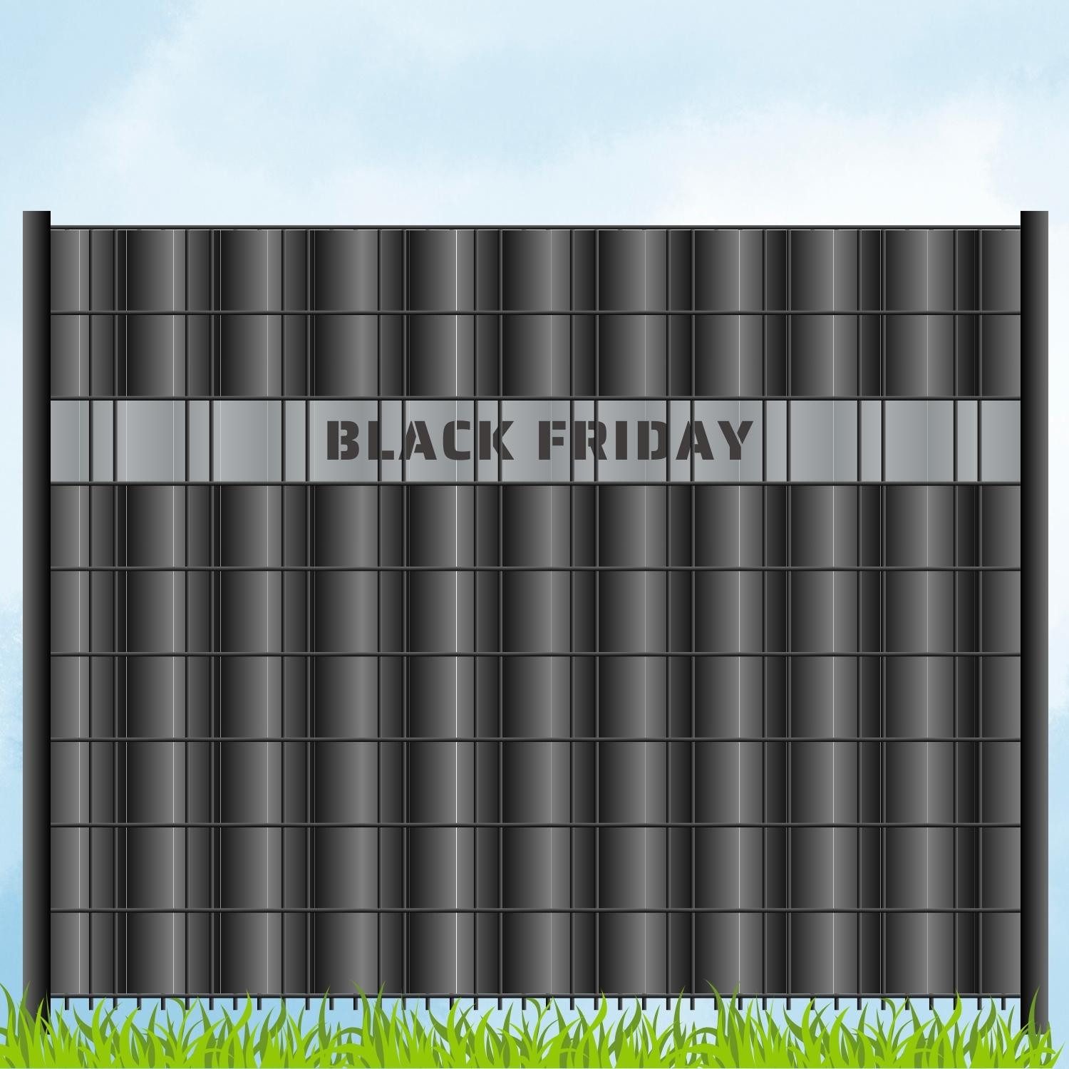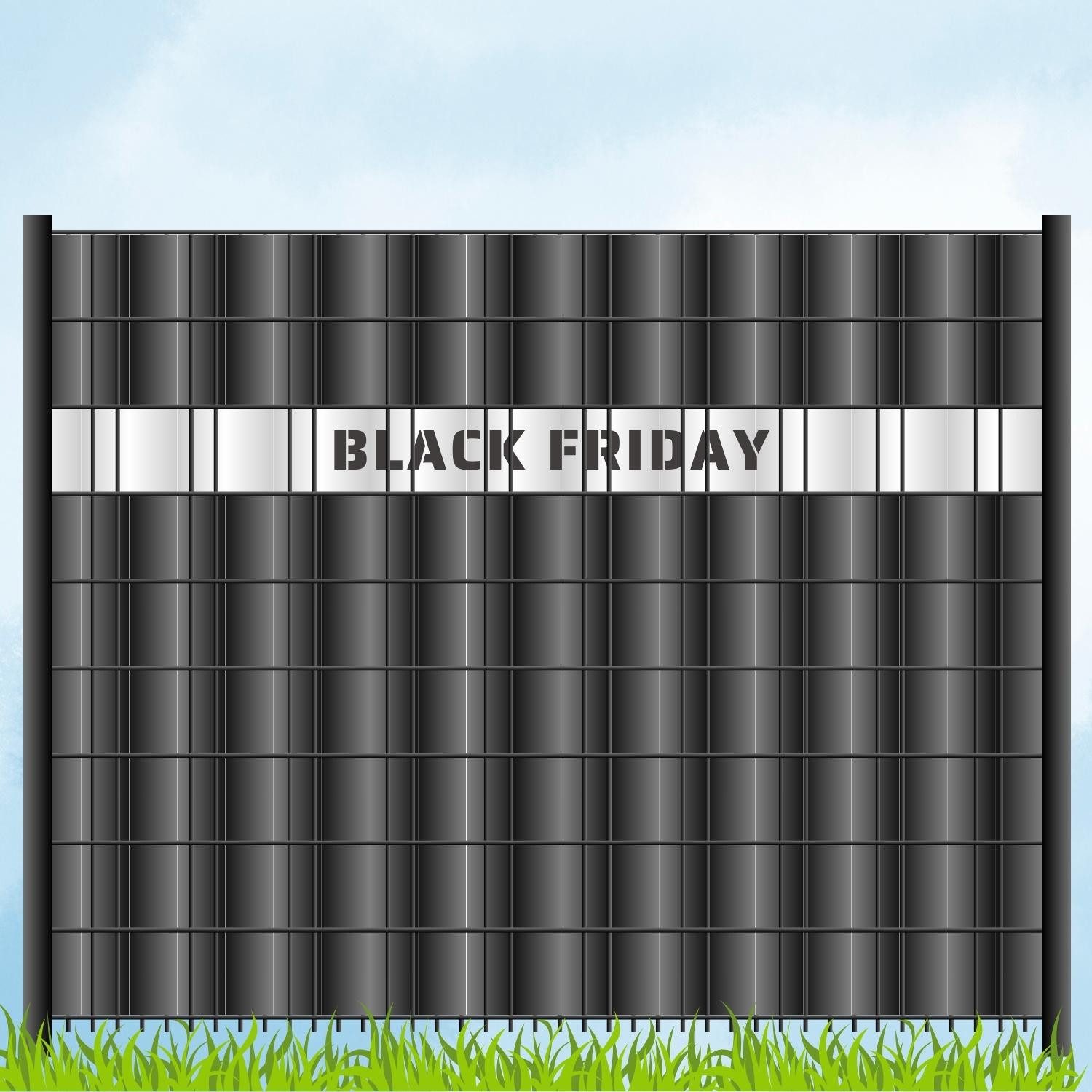 Der Schriftzug Black Friday ist direkt aus dem Material herausgelasert, was eine wetterbeständige und langlebige Alternative zu herkömmlich bedruckten Sichtschutzstreifen darstellt. Mit verschiedenen Farben zur Auswahl kannst du deinem Zaun ein individuelles und attraktives Aussehen verleihen.