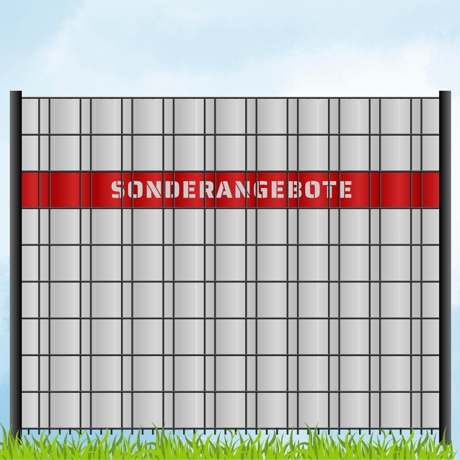 Der Schriftzug SONDERANGEBOTE ist direkt aus dem Material herausgelasert, was eine wetterbeständige und langlebige Alternative zu herkömmlich bedruckten Sichtschutzstreifen darstellt. Mit verschiedenen Farben zur Auswahl kannst du deinem Zaun ein individuelles und attraktives Aussehen verleihen.