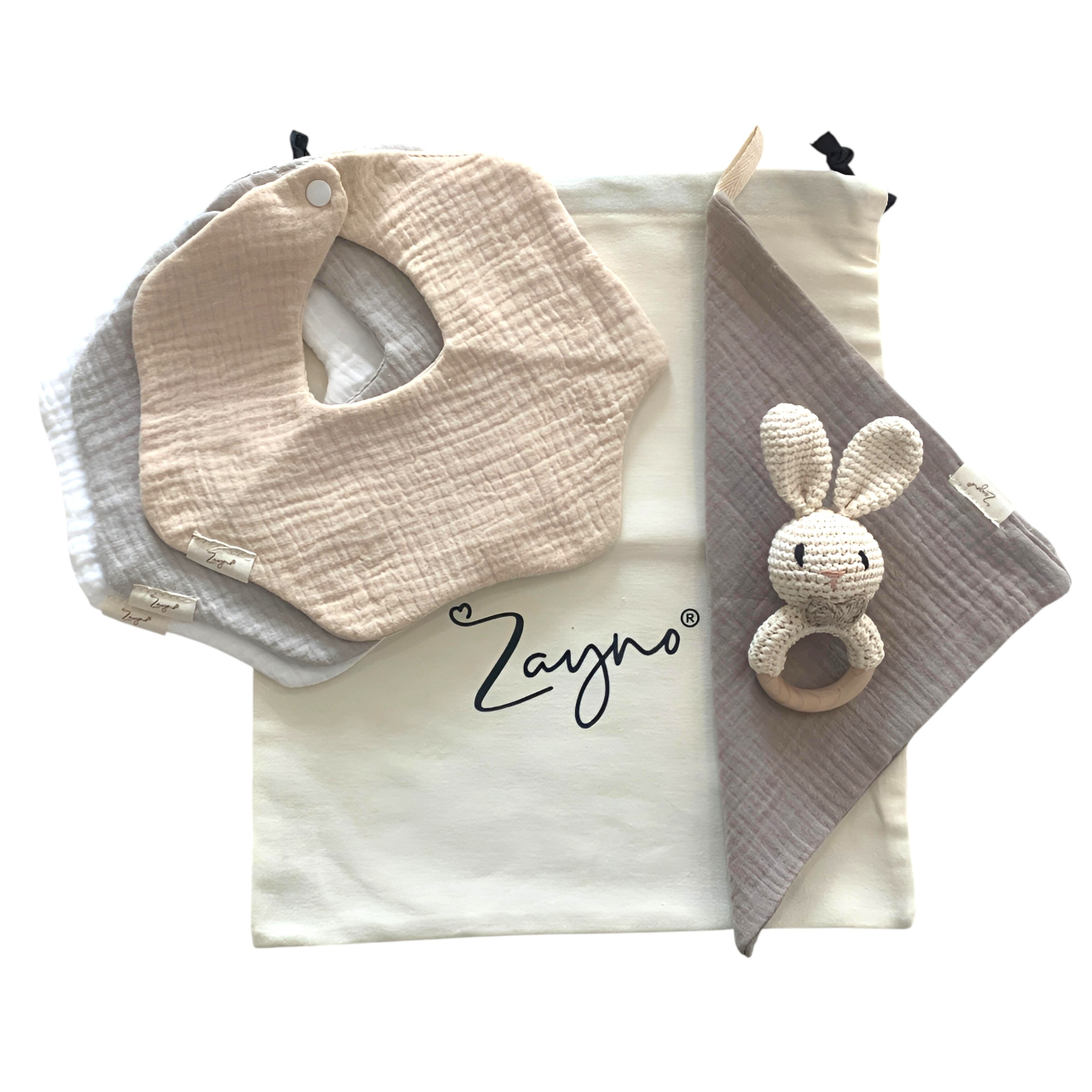 Es besteht aus 3 weichen Musselin-Lätzchen, einem passenden Musselin-Spucktuch mit Aufhängung sowie einem liebevoll gehäkelten Greifling im Häschen-Design. Verpackt ist alles in einer wiederverwendbaren Zayno® Stofftasche – perfekt zum Verschenken oder Aufbewahren von Babysachen.