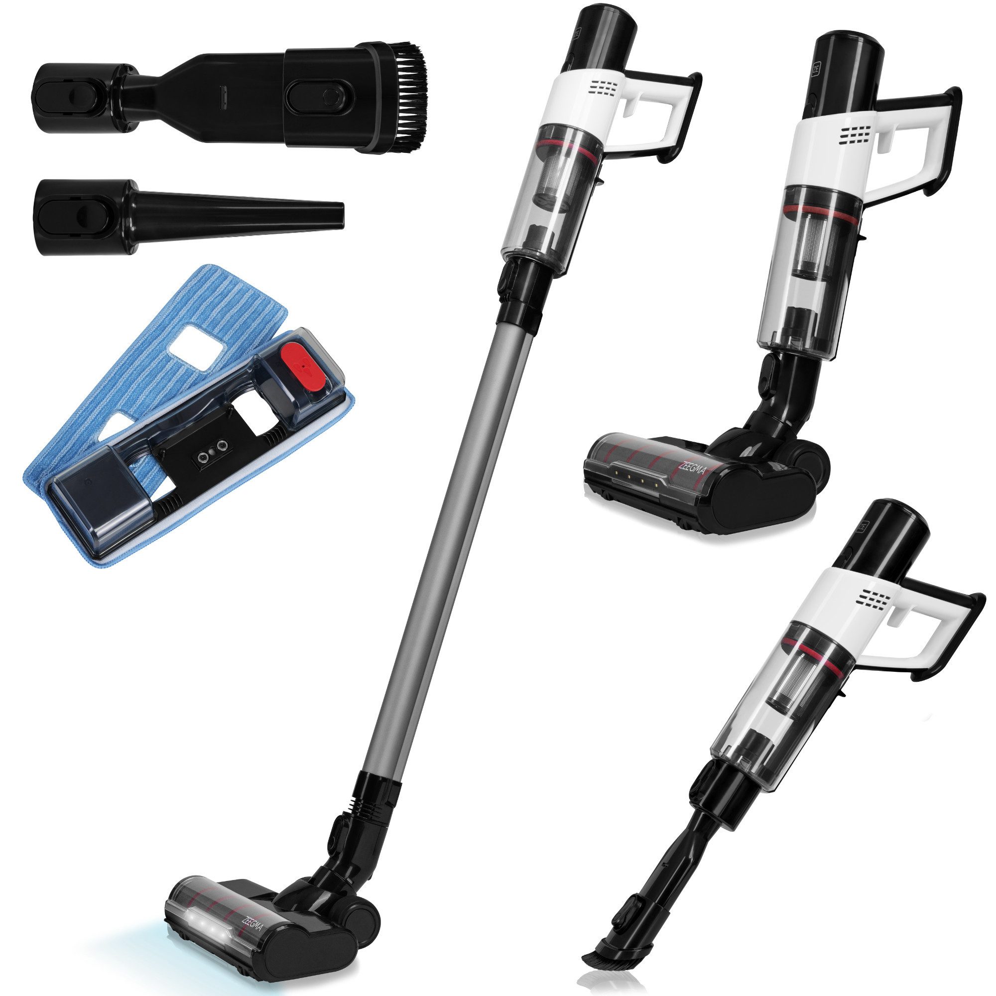 Elektrische Turbobürste mit LED-Licht und zwei austauschbaren Rollen (für harte und weiche Oberflächen und eine Kehrbürste für Teppiche), Fugendüse, 2-in-1-Düse mit Borsten und Polsterdüse, Moppkopf, Wischpad, 2 Mikrofaserpads