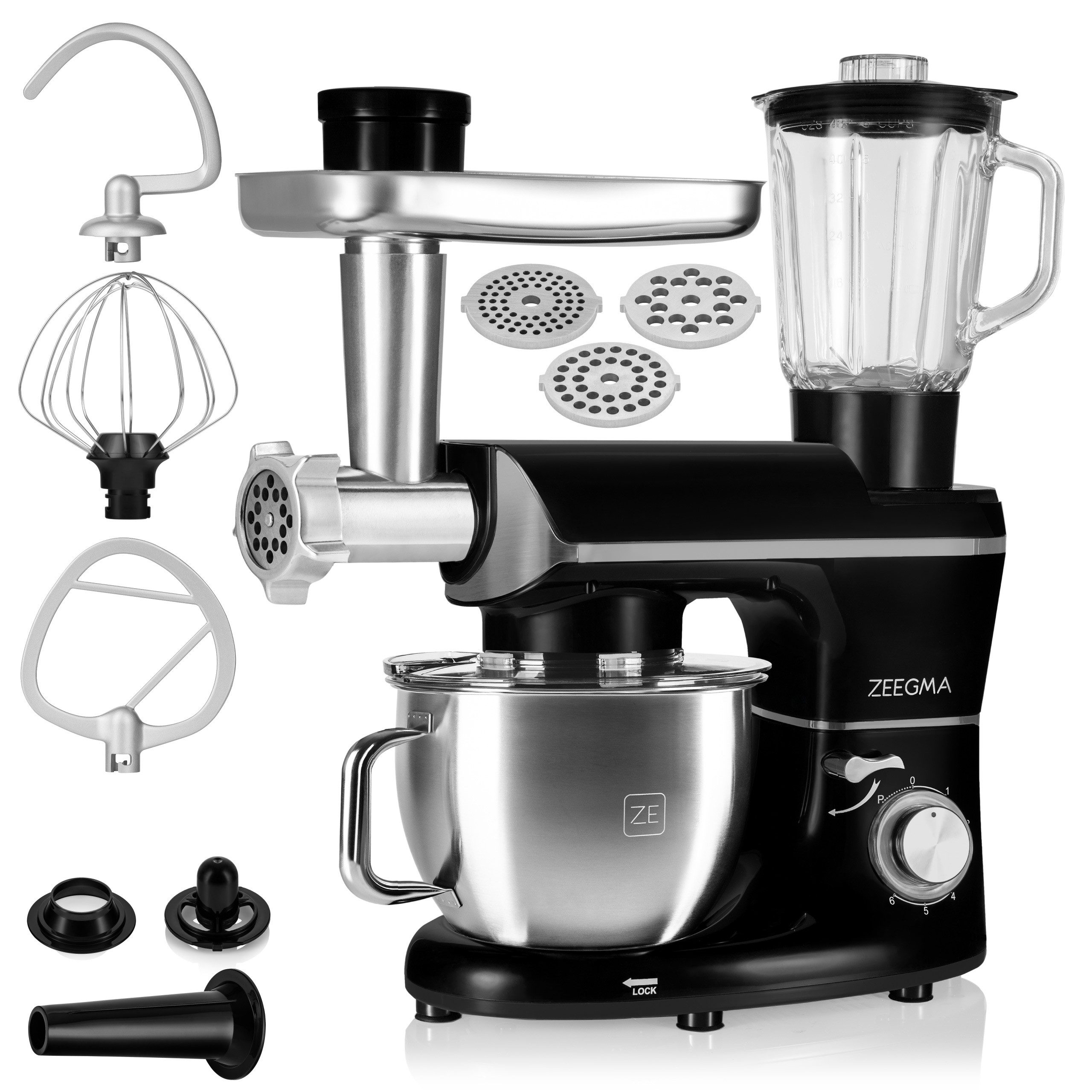 Planetenrotationstechnik | Leistung 1900 W | 6-stufige Geschwindigkeitsregelung | Pulsmodus | Schüssel 6,2 l Schüssel mit Deckel | Robustes Gehäuse | Einfache Drehknopfsteuerung | Haken | Wurstaufsatz | Kebbeaufsatz | Rührer | Schneebesen | Standmixer | Fleischwolf | 3 Lochscheiben mit verschiedener Lochgröße | Arm-Entriegelungsmechanismus | Rutschfeste Füße | Sicherheitsverriegelung | Überhitzungsschutz