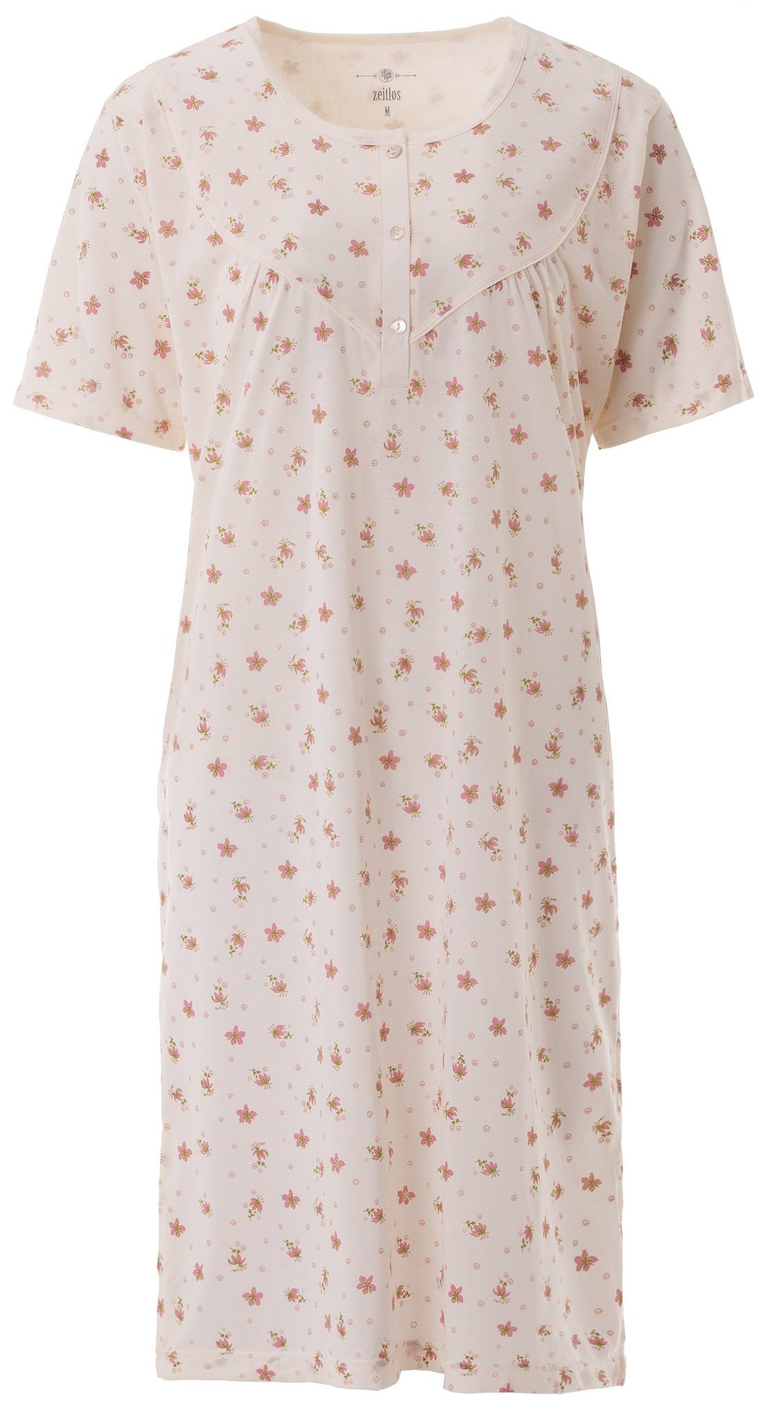 Der romantische Blütendruck ist farblich abgesetzt. Die dekorative Knopfleiste und die kleine Raffung im Brustbereich sind ein Eycatcher des Schlafshirts. Dieses Nachthemd wird Sie umschmeicheln.