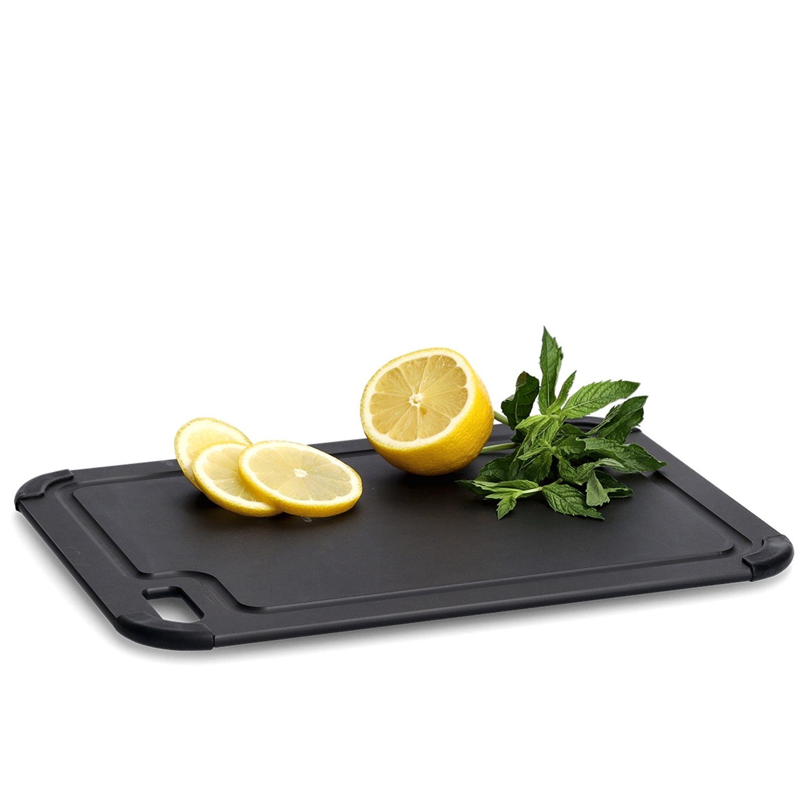 Du liebst das Kochen? Dann sollte das großes Eco-Schneidebrett aus Holzfaserlaminat definitiv zum Grundinventar Deiner Küche gehören! Das Material ist geschmacks- und geruchsneutral. Die praktische Unterlage präsentiert sich in stylischem Schwarz, inklusive Saftrille. Noch dazu ist das Schneidebrett spülmaschinengeeignet – was will man mehr? Maße: ca. 37 x 25,5 x 0,6 cm, Material: Holzfaserlaminat